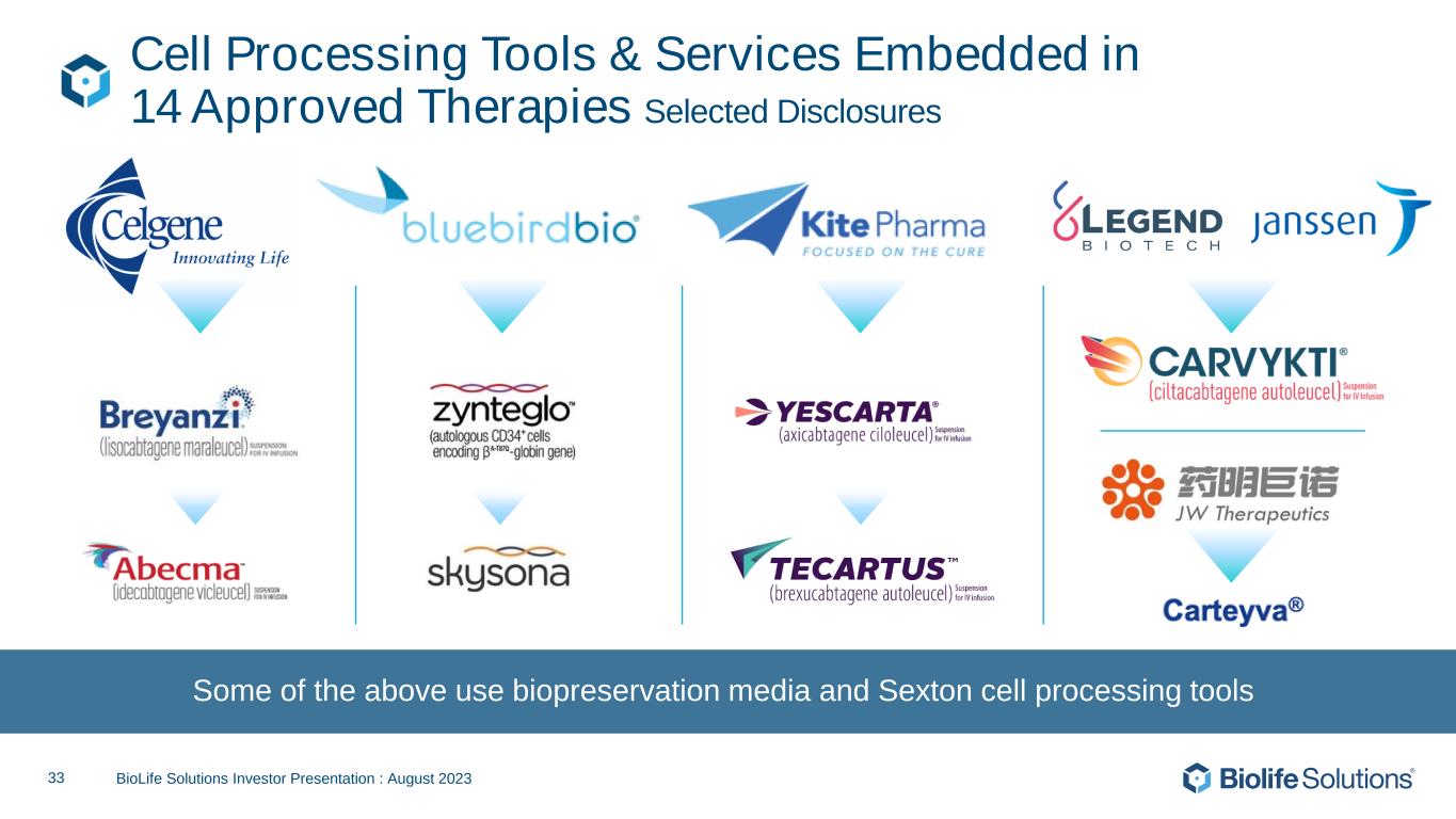 BioLife Solutions Investor Presentation : August 202333 Cell Processing Tools & Services Embedded in 14 Approved Therapies Selected Disclosures Some of the above use biopreservation media and Sexton cell processing tools