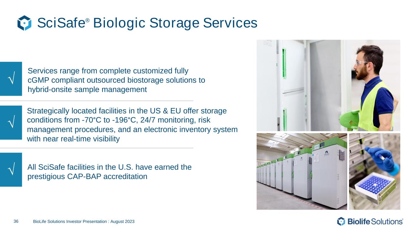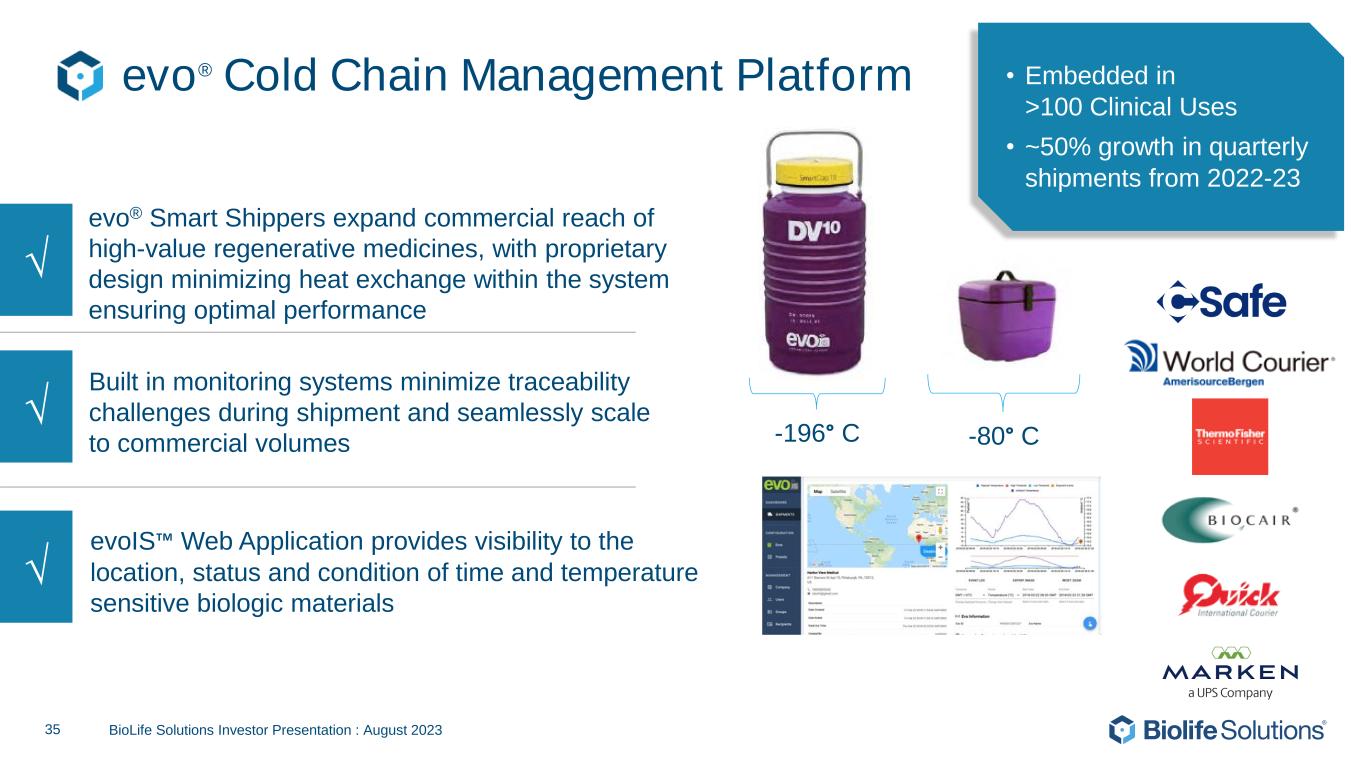 BioLife Solutions Investor Presentation : August 202335 evo® Cold Chain Management Platform -196° C -80° C • Embedded in >100 Clinical Uses • ~50% growth in quarterly shipments from 2022-23 Built in monitoring systems minimize traceability challenges during shipment and seamlessly scale to commercial volumes evoIS™ Web Application provides visibility to the location, status and condition of time and temperature sensitive biologic materials evo® Smart Shippers expand commercial reach of high-value regenerative medicines, with proprietary design minimizing heat exchange within the system ensuring optimal performance √ √ √