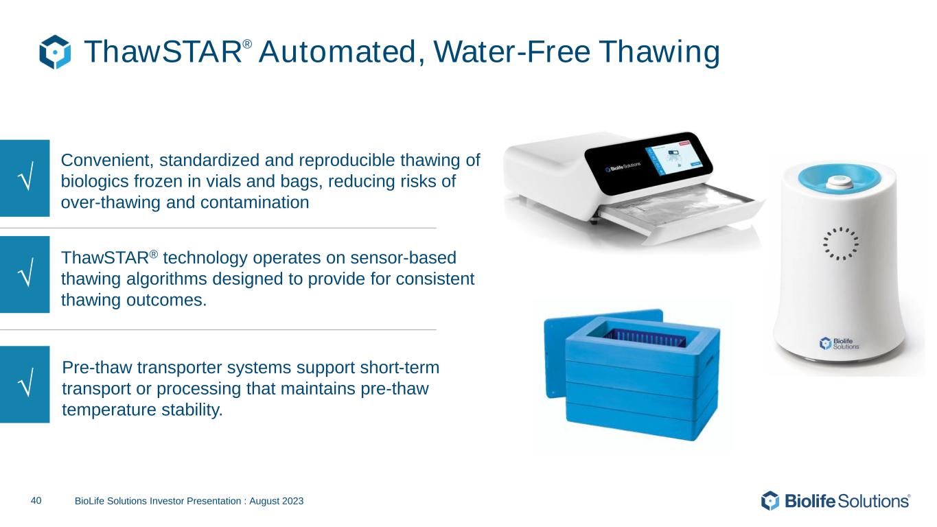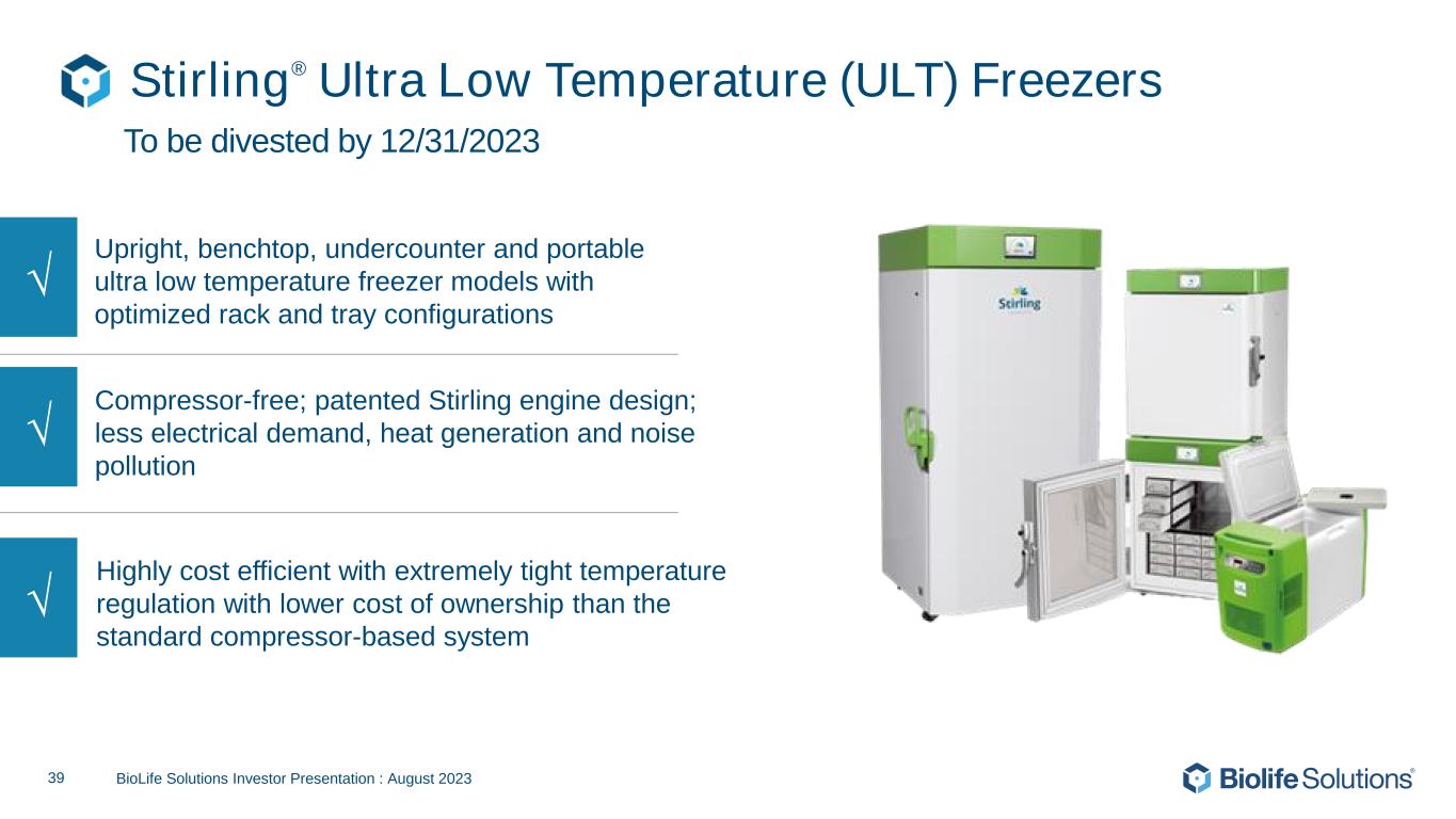 BioLife Solutions Investor Presentation : August 202339 To be divested by 12/31/2023 Stirling® Ultra Low Temperature (ULT) Freezers Compressor-free; patented Stirling engine design; less electrical demand, heat generation and noise pollution Highly cost efficient with extremely tight temperature regulation with lower cost of ownership than the standard compressor-based system Upright, benchtop, undercounter and portable ultra low temperature freezer models with optimized rack and tray configurations √ √ √