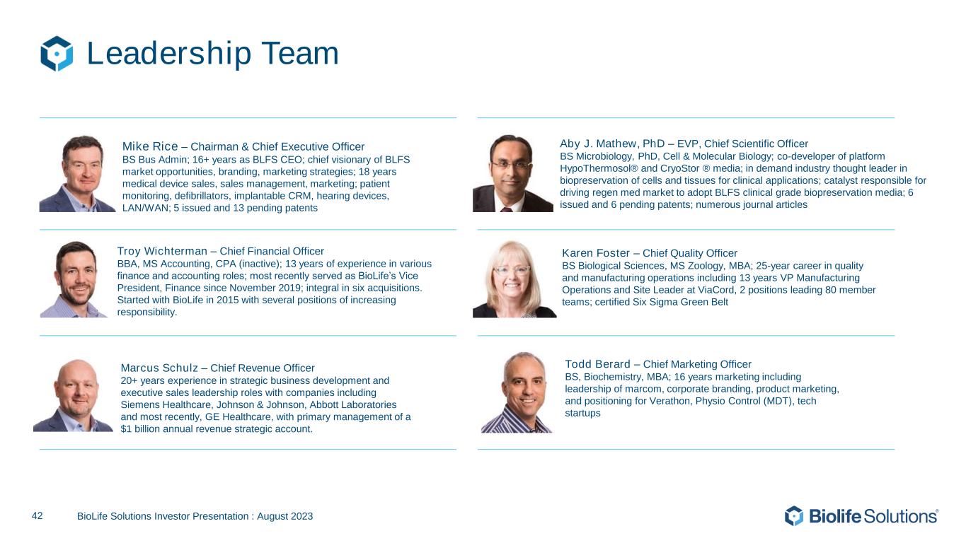 BioLife Solutions Investor Presentation : August 202341 Leadership