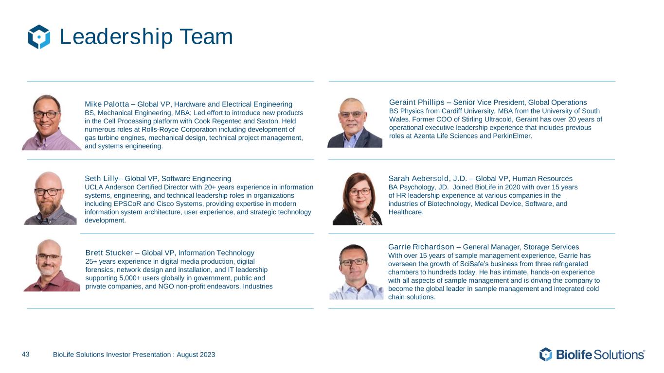 BioLife Solutions Investor Presentation : August 202343 Leadership Team Sarah Aebersold, J.D. – Global VP, Human Resources BA Psychology, JD. Joined BioLife in 2020 with over 15 years of HR leadership experience at various companies in the industries of Biotechnology, Medical Device, Software, and Healthcare. Mike Palotta – Global VP, Hardware and Electrical Engineering BS, Mechanical Engineering, MBA; Led effort to introduce new products in the Cell Processing platform with Cook Regentec and Sexton. Held numerous roles at Rolls-Royce Corporation including development of gas turbine engines, mechanical design, technical project management, and systems engineering. Seth Lilly– Global VP, Software Engineering UCLA Anderson Certified Director with 20+ years experience in information systems, engineering, and technical leadership roles in organizations including EPSCoR and Cisco Systems, providing expertise in modern information system architecture, user experience, and strategic technology development. Geraint Phillips – Senior Vice President, Global Operations BS Physics from Cardiff University, MBA from the University of South Wales. Former COO of Stirling Ultracold, Geraint has over 20 years of operational executive leadership experience that includes previous roles at Azenta Life Sciences and PerkinElmer. Brett Stucker – Global VP, Information Technology 25+ years experience in digital media production, digital forensics, network design and installation, and IT leadership supporting 5,000+ users globally in government, public and private companies, and NGO non-profit endeavors. Industries include law enforcement, defense, higher education, aerospace, and biotech manufacturing. Garrie Richardson – General Manager, Storage Services With over 15 years of sample management experience, Garrie has ove seen t e g owt of SciSafe’s b siness f om t ee ef ige ated chambers to hundreds today. He has intimate, hands-on experience with all aspects of sample management and is driving the company to become the global leader in sample management and integrated cold chain solutions.