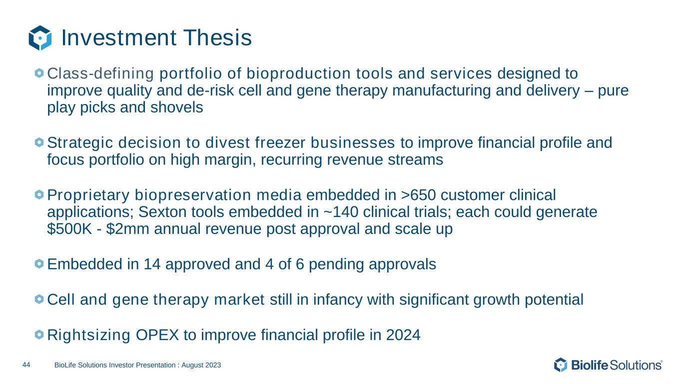BioLife Solutions Investor Presentation : August 202344 Investment Thesis Class-defining portfolio of bioproduction tools and services designed to improve quality and de-risk cell and gene therapy manufacturing and delivery – pure play picks and shovels Strategic decision to divest freezer businesses to improve financial profile and focus portfolio on high margin, recurring revenue streams Proprietary biopreservation media embedded in >650 customer clinical applications; Sexton tools embedded in ~140 clinical trials; each could generate $500K - $2mm annual revenue post approval and scale up Embedded in 14 approved and 4 of 6 pending approvals Cell and gene therapy market still in infancy with significant growth potential Rightsizing OPEX to improve financial profile in 2024