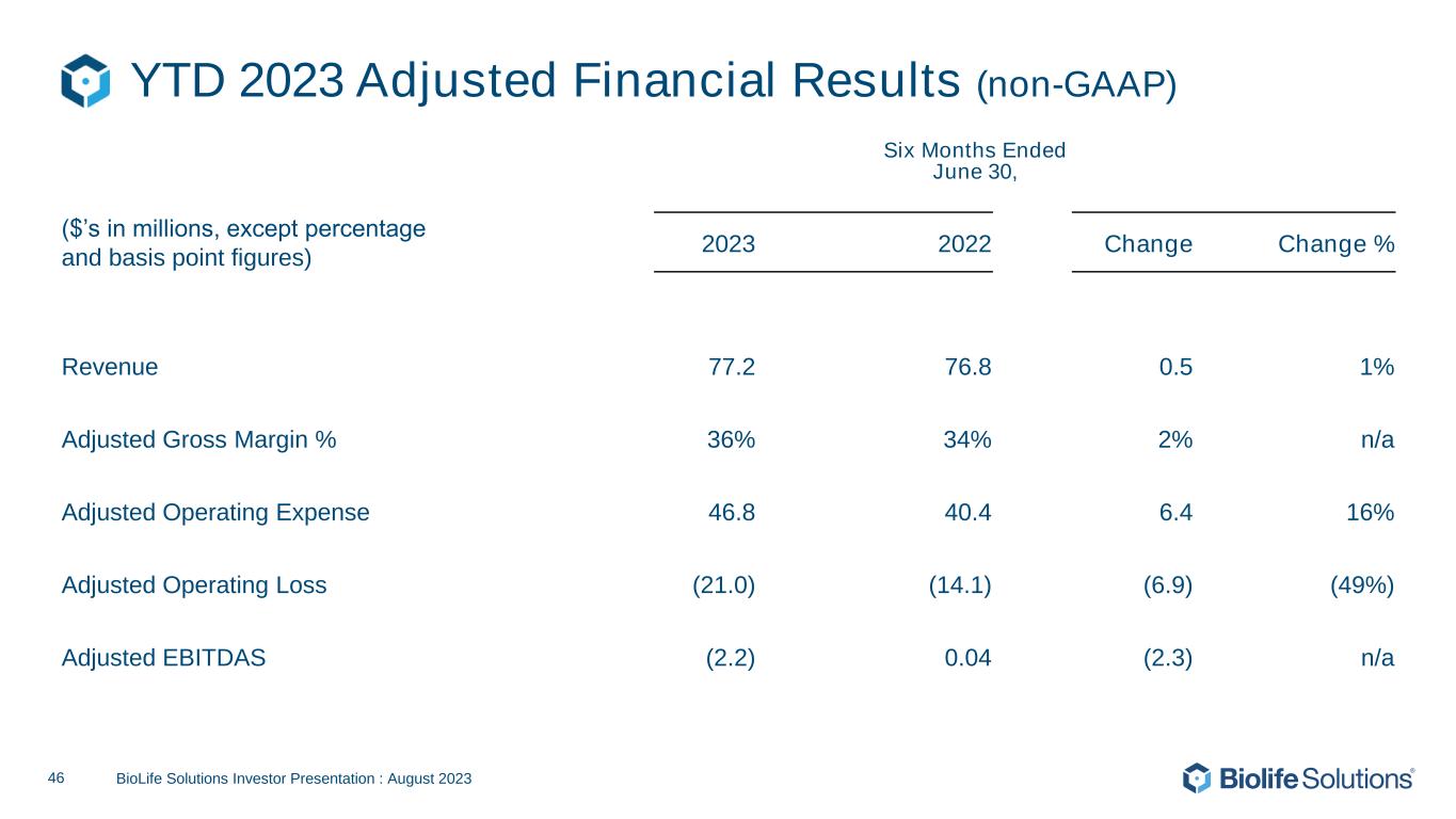BioLife Solutions Investor Presentation : August 202346 YTD 2023 Adjusted Financial Results (non-GAAP) Six Months Ended June 30, ($’s in millions, except pe centage and basis point figures) 2023 2022 Change Change % Revenue 77.2 76.8 0.5 1% Adjusted Gross Margin % 36% 34% 2% n/a Adjusted Operating Expense 46.8 40.4 6.4 16% Adjusted Operating Loss (21.0) (14.1) (6.9) (49%) Adjusted EBITDAS (2.2) 0.04 (2.3) n/a