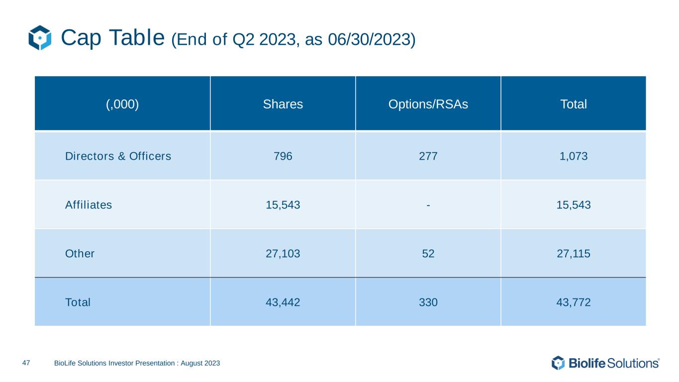 BioLife Solutions Investor Presentation : August 202347 Cap Table (End of Q2 2023, as 06/30/2023) (,000) Shares Options/RSAs Total Directors & Officers 796 277 1,073 Affiliates 15,543 - 15,543 Other 27,103 52 27,115 Total 43,442 330 43,772