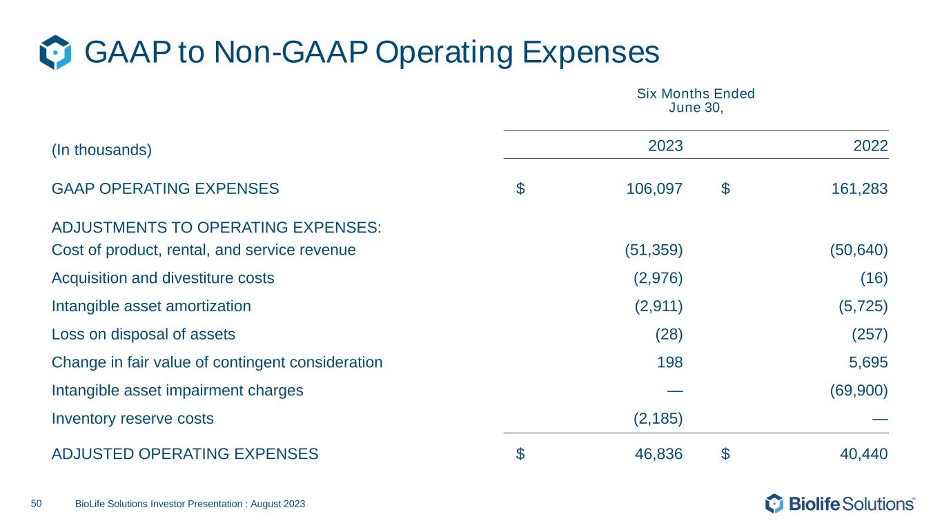 BioLife Solutions Investor Presentation : August 202349 GAAP to Non-GAAP Gross Profit Six Months Ended June 30, (In thousands) 2023 2022 GAAP GROSS PROFIT $ 24,385 $ 23,926 GAAP GROSS MARGIN 32 % 31 % ADJUSTMENTS TO GROSS PROFIT: Inventory step-up — 251 Inventory reserve costs 2,185 — Intangible asset amortization 1,466 2,186 ADJUSTED GROSS PROFIT $ 28,036 $ 26,363 ADJUSTED GROSS MARGIN 36 % 34 %