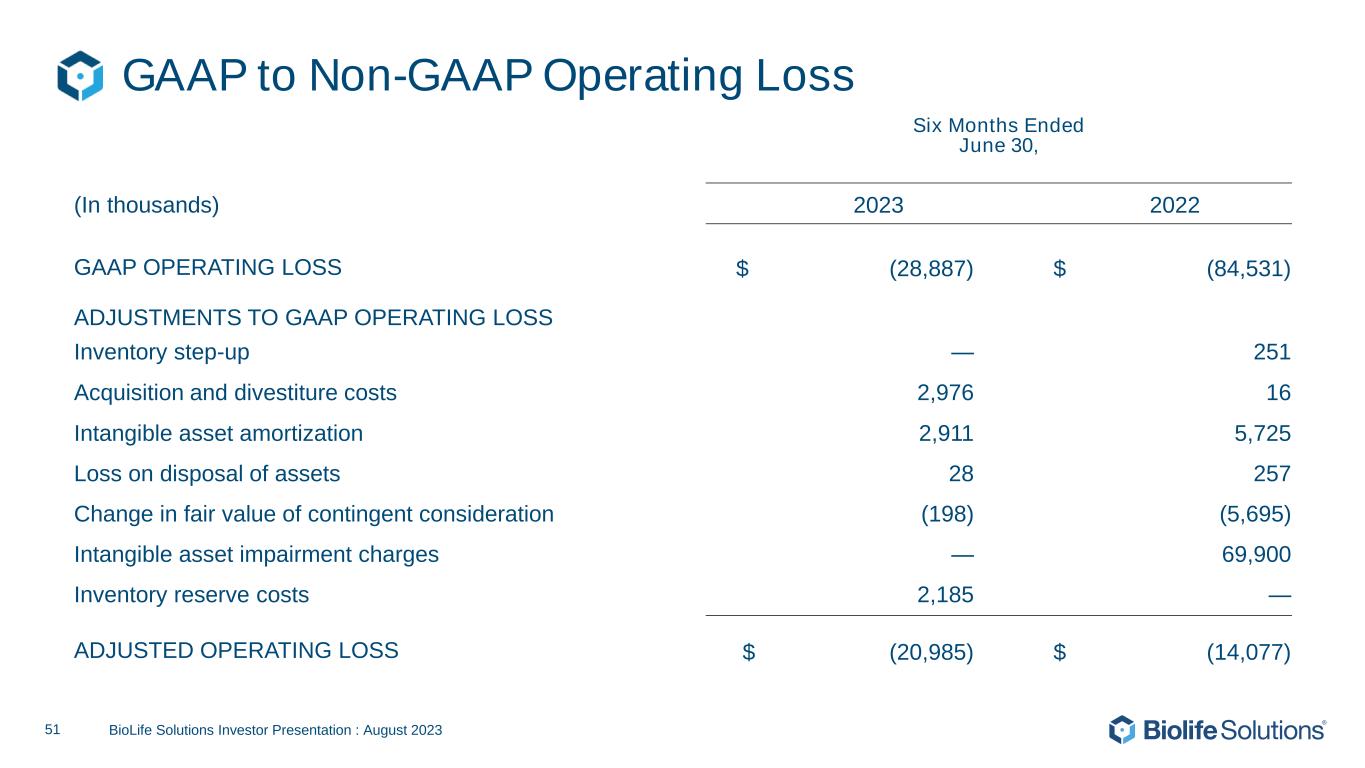 BioLife Solutions Investor Presentation : August 202350 GAAP to Non-GAAP Operating Expenses Six Months Ended June 30, (In thousands) 2023 2022 GAAP OPERATING EXPENSES $ 106,097 $ 161,283 ADJUSTMENTS TO OPERATING EXPENSES: Cost of product, rental, and service revenue (51,359) (50,640) Acquisition and divestiture costs (2,976) (16) Intangible asset amortization (2,911) (5,725) Loss on disposal of assets (28) (257) Change in fair value of contingent consideration 198 5,695 Intangible asset impairment charges — (69,900) Inventory reserve costs (2,185) — ADJUSTED OPERATING EXPENSES $ 46,836 $ 40,440