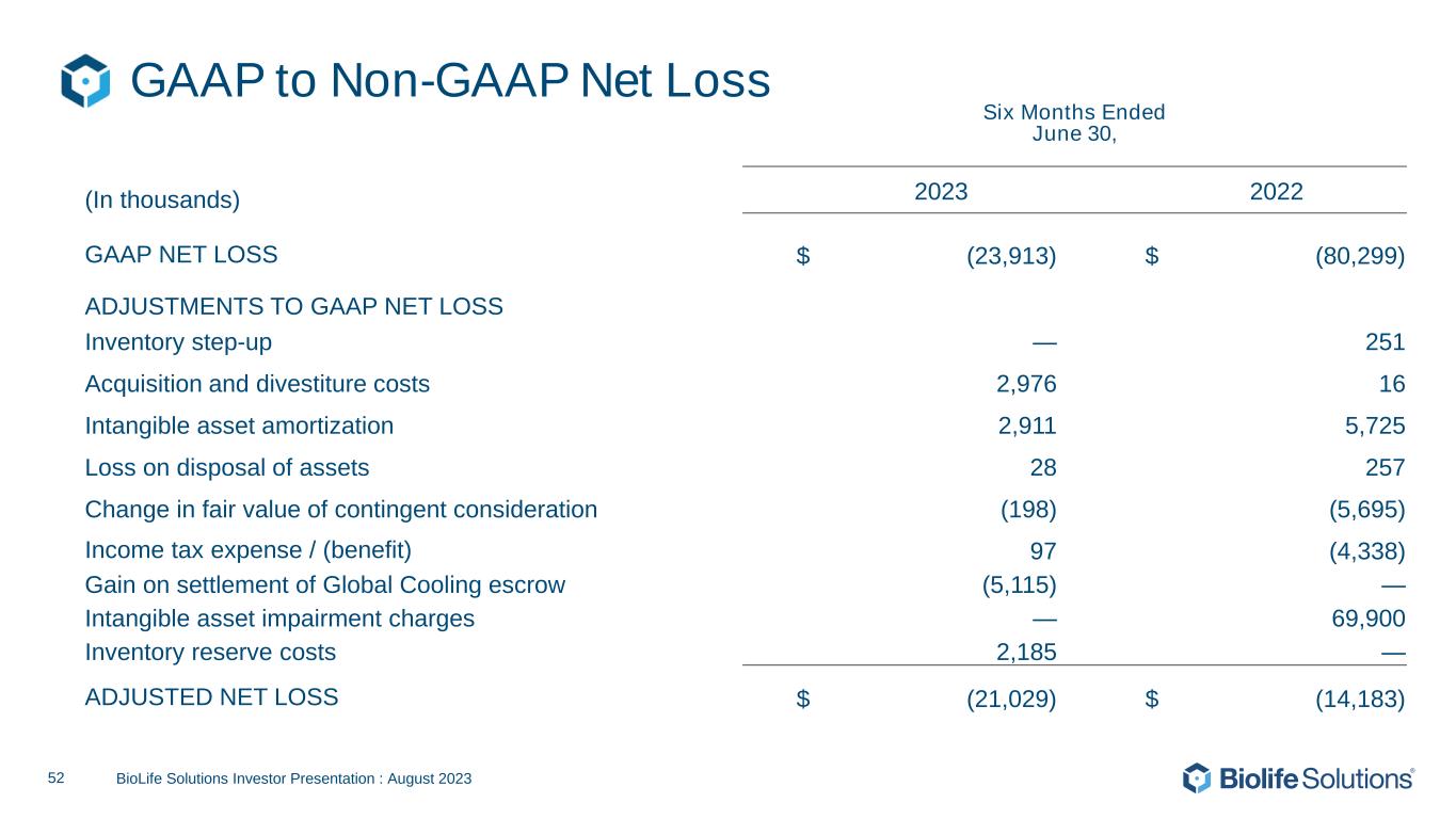 BioLife Solutions Investor Presentation : August 202351 GAAP to Non-GAAP Operating Loss Six Months Ended June 30, (In thousands) 2023 2022 GAAP OPERATING LOSS $ (28,887) $ (84,531) ADJUSTMENTS TO GAAP OPERATING LOSS Inventory step-up — 251 Acquisition and divestiture costs 2,976 16 Intangible asset amortization 2,911 5,725 Loss on disposal of assets 28 257 Change in fair value of contingent consideration (198) (5,695) Intangible asset impairment charges — 69,900 Inventory reserve costs 2,185 — ADJUSTED OPERATING LOSS $ (20,985) $ (14,077)
