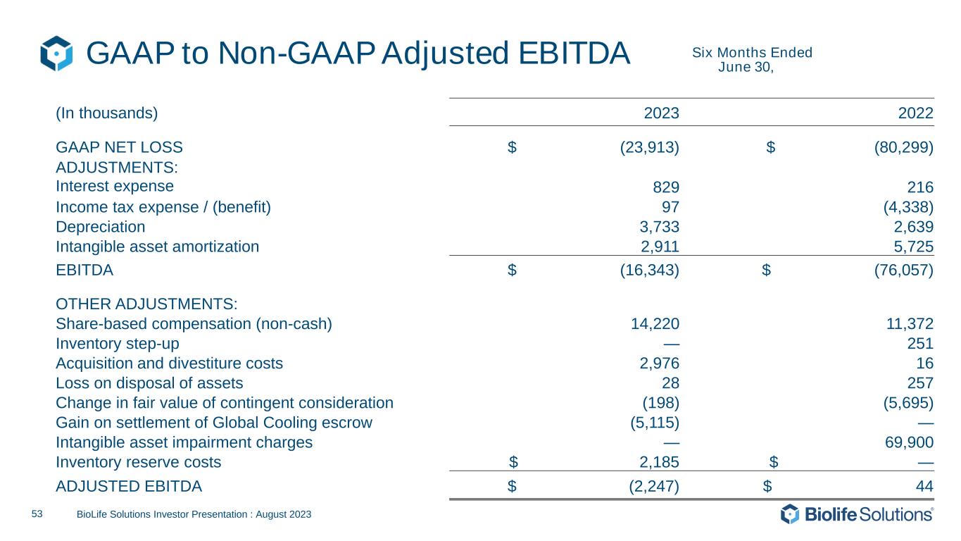 BioLife Solutions Investor Presentation : August 202352 GAAP to Non-GAAP Net Loss Six Months Ended June 30, (In thousands) 2023 2022 GAAP NET LOSS $ (23,913) $ (80,299) ADJUSTMENTS TO GAAP NET LOSS Inventory step-up — 251 Acquisition and divestiture costs 2,976 16 Intangible asset amortization 2,911 5,725 Loss on disposal of assets 28 257 Change in fair value of contingent consideration (198) (5,695) Income tax expense / (benefit) 97 (4,338) Gain on settlement of Global Cooling escrow (5,115) — Intangible asset impairment charges — 69,900 Inventory reserve costs 2,185 — ADJUSTED NET LOSS $ (21,029) $ (14,183)