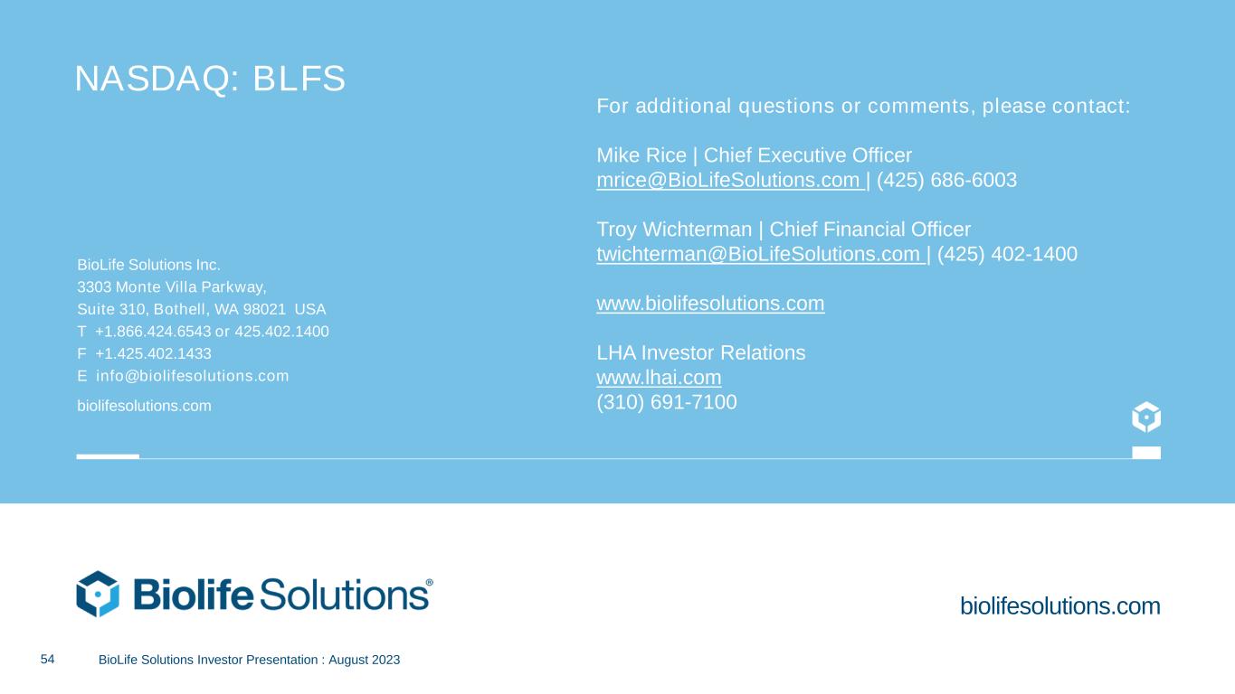 BioLife Solutions Investor Presentation : August 202354 BioLife Solutions Inc. 3303 Monte Villa Parkway, Suite 310, Bothell, WA 98021 USA T +1.866.424.6543 or 425.402.1400 F +1.425.402.1433 E info@biolifesolutions.com biolifesolutions.com biolifesolutions.com For additional questions or comments, please contact: Mike Rice | Chief Executive Officer mrice@BioLifeSolutions.com | (425) 686-6003 Troy Wichterman | Chief Financial Officer twichterman@BioLifeSolutions.com | (425) 402-1400 www.biolifesolutions.com LHA Investor Relations www.lhai.com (310) 691-7100 NASDAQ: BLFS