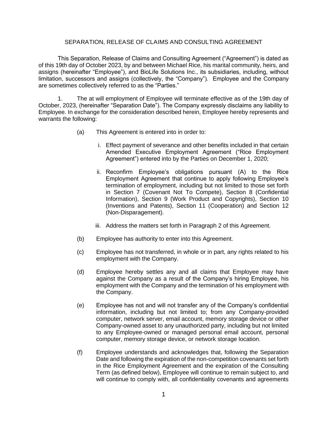 1 SEPARATION, RELEASE OF CLAIMS AND CONSULTING AGREEMENT This Separation, Release of Claims and Consulting Agreement (“Agreement”) is dated as of this 19th day of October 2023, by and between Michael Rice, his marital community, heirs, and assigns (hereinafter “Employee”), and BioLife Solutions Inc., its subsidiaries, including, without limitation, successors and assigns (collectively, the “Company”). Employee and the Company are sometimes collectively referred to as the “Parties.” 1. The at will employment of Employee will terminate effective as of the 19th day of October, 2023, (hereinafter “Separation Date”). The Company expressly disclaims any liability to Employee. In exchange for the consideration described herein, Employee hereby represents and warrants the following: (a) This Agreement is entered into in order to: i. Effect payment of severance and other benefits included in that certain Amended Executive Employment Agreement (“Rice Employment Agreement”) entered into by the Parties on December 1, 2020; ii. Reconfirm Employee’s obligations pursuant (A) to the Rice Employment Agreement that continue to apply following Employee’s termination of employment, including but not limited to those set forth in Section 7 (Covenant Not To Compete), Section 8 (Confidential Information), Section 9 (Work Product and Copyrights), Section 10 (Inventions and Patents), Section 11 (Cooperation) and Section 12 (Non-Disparagement). iii. Address the matters set forth in Paragraph 2 of this Agreement. (b) Employee has authority to enter into this Agreement. (c) Employee has not transferred, in whole or in part, any rights related to his employment with the Company. (d) Employee hereby settles any and all claims that Employee may have against the Company as a result of the Company’s hiring Employee, his employment with the Company and the termination of his employment with the Company. (e) Employee has not and will not transfer any of the Company’s confidential information, including but not limited to; from any Company-provided computer, network server, email account, memory storage device or other Company-owned asset to any unauthorized party, including but not limited to any Employee-owned or managed personal email account, personal computer, memory storage device, or network storage location. (f) Employee understands and acknowledges that, following the Separation Date and following the expiration of the non-competition covenants set forth in the Rice Employment Agreement and the expiration of the Consulting Term (as defined below), Employee will continue to remain subject to, and will continue to comply with, all confidentiality covenants and agreements