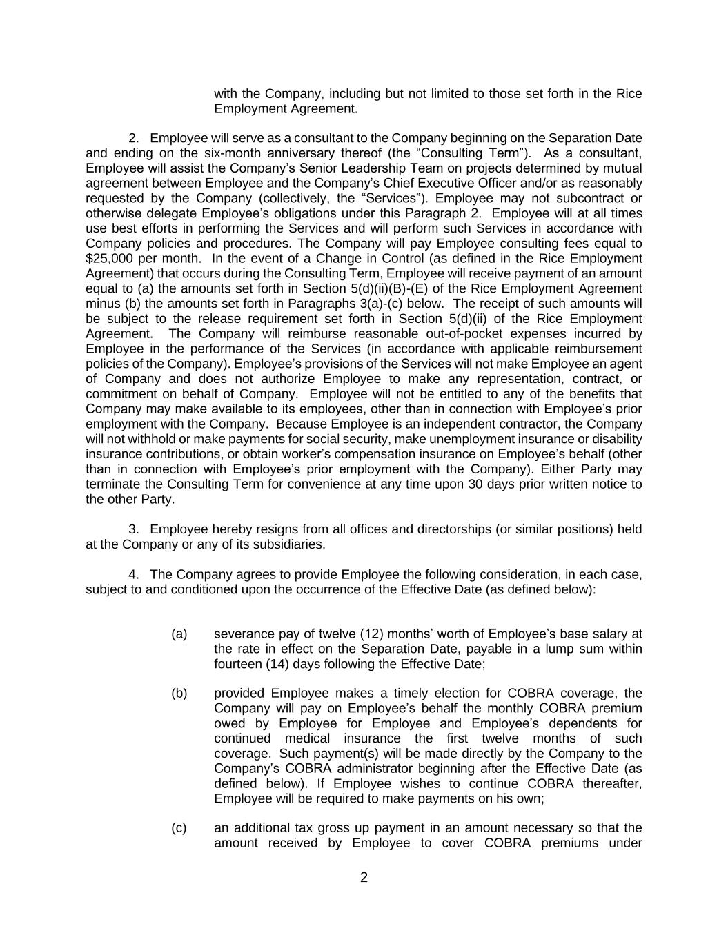 2 with the Company, including but not limited to those set forth in the Rice Employment Agreement. 2. Employee will serve as a consultant to the Company beginning on the Separation Date and ending on the six-month anniversary thereof (the “Consulting Term”). As a consultant, Employee will assist the Company’s Senior Leadership Team on projects determined by mutual agreement between Employee and the Company’s Chief Executive Officer and/or as reasonably requested by the Company (collectively, the “Services”). Employee may not subcontract or otherwise delegate Employee’s obligations under this Paragraph 2. Employee will at all times use best efforts in performing the Services and will perform such Services in accordance with Company policies and procedures. The Company will pay Employee consulting fees equal to $25,000 per month. In the event of a Change in Control (as defined in the Rice Employment Agreement) that occurs during the Consulting Term, Employee will receive payment of an amount equal to (a) the amounts set forth in Section 5(d)(ii)(B)-(E) of the Rice Employment Agreement minus (b) the amounts set forth in Paragraphs 3(a)-(c) below. The receipt of such amounts will be subject to the release requirement set forth in Section 5(d)(ii) of the Rice Employment Agreement. The Company will reimburse reasonable out-of-pocket expenses incurred by Employee in the performance of the Services (in accordance with applicable reimbursement policies of the Company). Employee’s provisions of the Services will not make Employee an agent of Company and does not authorize Employee to make any representation, contract, or commitment on behalf of Company. Employee will not be entitled to any of the benefits that Company may make available to its employees, other than in connection with Employee’s prior employment with the Company. Because Employee is an independent contractor, the Company will not withhold or make payments for social security, make unemployment insurance or disability insurance contributions, or obtain worker’s compensation insurance on Employee’s behalf (other than in connection with Employee’s prior employment with the Company). Either Party may terminate the Consulting Term for convenience at any time upon 30 days prior written notice to the other Party. 3. Employee hereby resigns from all offices and directorships (or similar positions) held at the Company or any of its subsidiaries. 4. The Company agrees to provide Employee the following consideration, in each case, subject to and conditioned upon the occurrence of the Effective Date (as defined below): (a) severance pay of twelve (12) months’ worth of Employee’s base salary at the rate in effect on the Separation Date, payable in a lump sum within fourteen (14) days following the Effective Date; (b) provided Employee makes a timely election for COBRA coverage, the Company will pay on Employee’s behalf the monthly COBRA premium owed by Employee for Employee and Employee’s dependents for continued medical insurance the first twelve months of such coverage. Such payment(s) will be made directly by the Company to the Company’s COBRA administrator beginning after the Effective Date (as defined below). If Employee wishes to continue COBRA thereafter, Employee will be required to make payments on his own; (c) an additional tax gross up payment in an amount necessary so that the amount received by Employee to cover COBRA premiums under