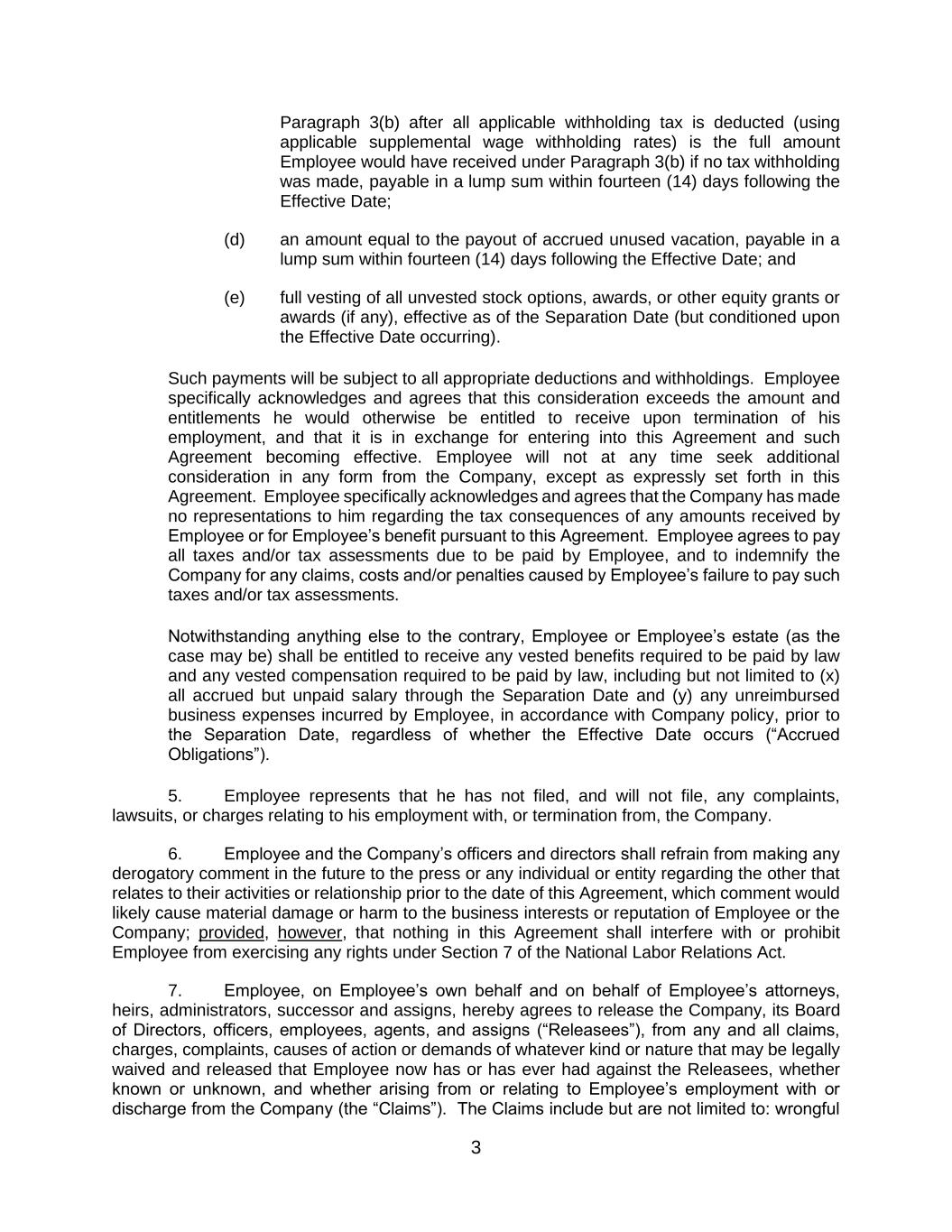 3 Paragraph 3(b) after all applicable withholding tax is deducted (using applicable supplemental wage withholding rates) is the full amount Employee would have received under Paragraph 3(b) if no tax withholding was made, payable in a lump sum within fourteen (14) days following the Effective Date; (d) an amount equal to the payout of accrued unused vacation, payable in a lump sum within fourteen (14) days following the Effective Date; and (e) full vesting of all unvested stock options, awards, or other equity grants or awards (if any), effective as of the Separation Date (but conditioned upon the Effective Date occurring). Such payments will be subject to all appropriate deductions and withholdings. Employee specifically acknowledges and agrees that this consideration exceeds the amount and entitlements he would otherwise be entitled to receive upon termination of his employment, and that it is in exchange for entering into this Agreement and such Agreement becoming effective. Employee will not at any time seek additional consideration in any form from the Company, except as expressly set forth in this Agreement. Employee specifically acknowledges and agrees that the Company has made no representations to him regarding the tax consequences of any amounts received by Employee or for Employee’s benefit pursuant to this Agreement. Employee agrees to pay all taxes and/or tax assessments due to be paid by Employee, and to indemnify the Company for any claims, costs and/or penalties caused by Employee’s failure to pay such taxes and/or tax assessments. Notwithstanding anything else to the contrary, Employee or Employee’s estate (as the case may be) shall be entitled to receive any vested benefits required to be paid by law and any vested compensation required to be paid by law, including but not limited to (x) all accrued but unpaid salary through the Separation Date and (y) any unreimbursed business expenses incurred by Employee, in accordance with Company policy, prior to the Separation Date, regardless of whether the Effective Date occurs (“Accrued Obligations”). 5. Employee represents that he has not filed, and will not file, any complaints, lawsuits, or charges relating to his employment with, or termination from, the Company. 6. Employee and the Company’s officers and directors shall refrain from making any derogatory comment in the future to the press or any individual or entity regarding the other that relates to their activities or relationship prior to the date of this Agreement, which comment would likely cause material damage or harm to the business interests or reputation of Employee or the Company; provided, however, that nothing in this Agreement shall interfere with or prohibit Employee from exercising any rights under Section 7 of the National Labor Relations Act. 7. Employee, on Employee’s own behalf and on behalf of Employee’s attorneys, heirs, administrators, successor and assigns, hereby agrees to release the Company, its Board of Directors, officers, employees, agents, and assigns (“Releasees”), from any and all claims, charges, complaints, causes of action or demands of whatever kind or nature that may be legally waived and released that Employee now has or has ever had against the Releasees, whether known or unknown, and whether arising from or relating to Employee’s employment with or discharge from the Company (the “Claims”). The Claims include but are not limited to: wrongful
