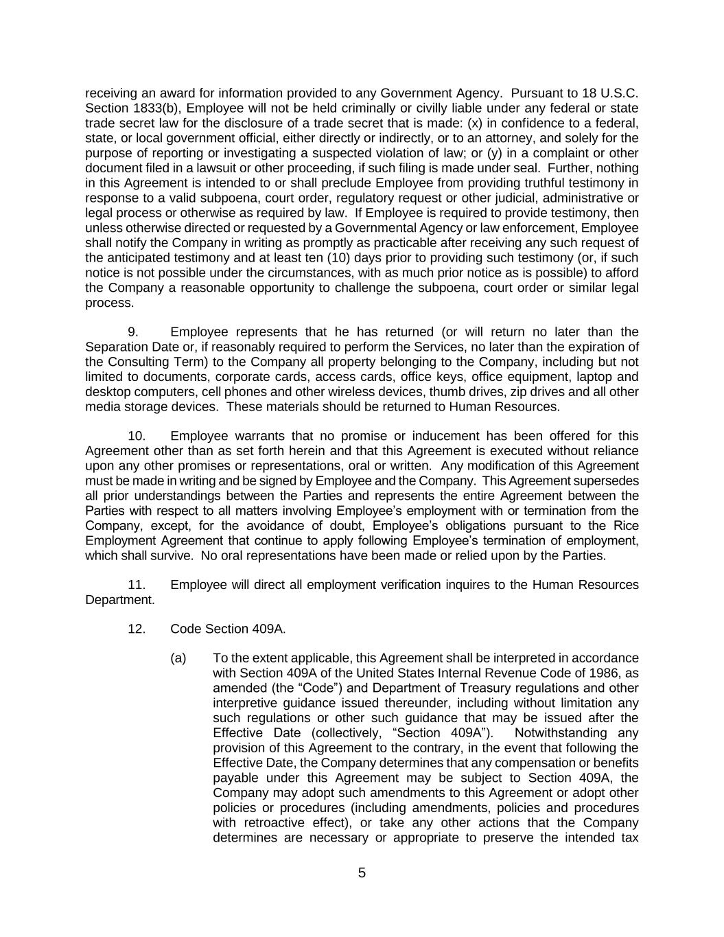 5 receiving an award for information provided to any Government Agency. Pursuant to 18 U.S.C. Section 1833(b), Employee will not be held criminally or civilly liable under any federal or state trade secret law for the disclosure of a trade secret that is made: (x) in confidence to a federal, state, or local government official, either directly or indirectly, or to an attorney, and solely for the purpose of reporting or investigating a suspected violation of law; or (y) in a complaint or other document filed in a lawsuit or other proceeding, if such filing is made under seal. Further, nothing in this Agreement is intended to or shall preclude Employee from providing truthful testimony in response to a valid subpoena, court order, regulatory request or other judicial, administrative or legal process or otherwise as required by law. If Employee is required to provide testimony, then unless otherwise directed or requested by a Governmental Agency or law enforcement, Employee shall notify the Company in writing as promptly as practicable after receiving any such request of the anticipated testimony and at least ten (10) days prior to providing such testimony (or, if such notice is not possible under the circumstances, with as much prior notice as is possible) to afford the Company a reasonable opportunity to challenge the subpoena, court order or similar legal process. 9. Employee represents that he has returned (or will return no later than the Separation Date or, if reasonably required to perform the Services, no later than the expiration of the Consulting Term) to the Company all property belonging to the Company, including but not limited to documents, corporate cards, access cards, office keys, office equipment, laptop and desktop computers, cell phones and other wireless devices, thumb drives, zip drives and all other media storage devices. These materials should be returned to Human Resources. 10. Employee warrants that no promise or inducement has been offered for this Agreement other than as set forth herein and that this Agreement is executed without reliance upon any other promises or representations, oral or written. Any modification of this Agreement must be made in writing and be signed by Employee and the Company. This Agreement supersedes all prior understandings between the Parties and represents the entire Agreement between the Parties with respect to all matters involving Employee’s employment with or termination from the Company, except, for the avoidance of doubt, Employee’s obligations pursuant to the Rice Employment Agreement that continue to apply following Employee’s termination of employment, which shall survive. No oral representations have been made or relied upon by the Parties. 11. Employee will direct all employment verification inquires to the Human Resources Department. 12. Code Section 409A. (a) To the extent applicable, this Agreement shall be interpreted in accordance with Section 409A of the United States Internal Revenue Code of 1986, as amended (the “Code”) and Department of Treasury regulations and other interpretive guidance issued thereunder, including without limitation any such regulations or other such guidance that may be issued after the Effective Date (collectively, “Section 409A”). Notwithstanding any provision of this Agreement to the contrary, in the event that following the Effective Date, the Company determines that any compensation or benefits payable under this Agreement may be subject to Section 409A, the Company may adopt such amendments to this Agreement or adopt other policies or procedures (including amendments, policies and procedures with retroactive effect), or take any other actions that the Company determines are necessary or appropriate to preserve the intended tax