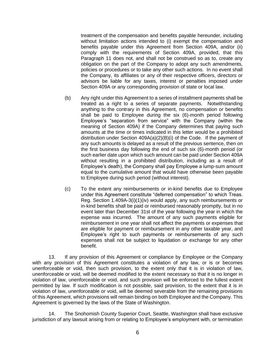 6 treatment of the compensation and benefits payable hereunder, including without limitation actions intended to (i) exempt the compensation and benefits payable under this Agreement from Section 409A, and/or (ii) comply with the requirements of Section 409A, provided, that this Paragraph 11 does not, and shall not be construed so as to, create any obligation on the part of the Company to adopt any such amendments, policies or procedures or to take any other such actions. In no event shall the Company, its affiliates or any of their respective officers, directors or advisors be liable for any taxes, interest or penalties imposed under Section 409A or any corresponding provision of state or local law. (b) Any right under this Agreement to a series of installment payments shall be treated as a right to a series of separate payments. Notwithstanding anything to the contrary in this Agreement, no compensation or benefits shall be paid to Employee during the six (6)-month period following Employee’s “separation from service” with the Company (within the meaning of Section 409A) if the Company determines that paying such amounts at the time or times indicated in this letter would be a prohibited distribution under Section 409A(a)(2)(B)(i) of the Code. If the payment of any such amounts is delayed as a result of the previous sentence, then on the first business day following the end of such six (6)-month period (or such earlier date upon which such amount can be paid under Section 409A without resulting in a prohibited distribution, including as a result of Employee’s death), the Company shall pay Employee a lump-sum amount equal to the cumulative amount that would have otherwise been payable to Employee during such period (without interest). (c) To the extent any reimbursements or in-kind benefits due to Employee under this Agreement constitute “deferred compensation” to which Treas. Reg. Section 1.409A-3(i)(1)(iv) would apply, any such reimbursements or in-kind benefits shall be paid or reimbursed reasonably promptly, but in no event later than December 31st of the year following the year in which the expense was incurred. The amount of any such payments eligible for reimbursement in one year shall not affect the payments or expenses that are eligible for payment or reimbursement in any other taxable year, and Employee’s right to such payments or reimbursements of any such expenses shall not be subject to liquidation or exchange for any other benefit. 13. If any provision of this Agreement or compliance by Employee or the Company with any provision of this Agreement constitutes a violation of any law, or is or becomes unenforceable or void, then such provision, to the extent only that it is in violation of law, unenforceable or void, will be deemed modified to the extent necessary so that it is no longer in violation of law, unenforceable or void, and such provision will be enforced to the fullest extent permitted by law. If such modification is not possible, said provision, to the extent that it is in violation of law, unenforceable or void, will be deemed severable from the remaining provisions of this Agreement, which provisions will remain binding on both Employee and the Company. This Agreement is governed by the laws of the State of Washington. 14. The Snohomish County Superior Court, Seattle, Washington shall have exclusive jurisdiction of any lawsuit arising from or relating to Employee’s employment with, or termination