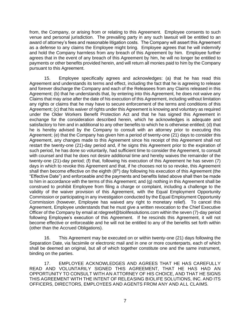 7 from, the Company, or arising from or relating to this Agreement. Employee consents to such venue and personal jurisdiction. The prevailing party in any such lawsuit will be entitled to an award of attorney’s fees and reasonable litigation costs. The Company will assert this Agreement as a defense to any claims the Employee might bring. Employee agrees that he will indemnify and hold the Company harmless from any breach of this Agreement by him. Employee further agrees that in the event of any breach of this Agreement by him, he will no longer be entitled to payments or other benefits provided herein, and will return all monies paid to him by the Company pursuant to this Agreement. 15. Employee specifically agrees and acknowledges: (a) that he has read this Agreement and understands its terms and effect, including the fact that he is agreeing to release and forever discharge the Company and each of the Releasees from any Claims released in this Agreement; (b) that he understands that, by entering into this Agreement, he does not waive any Claims that may arise after the date of his execution of this Agreement, including without limitation any rights or claims that he may have to secure enforcement of the terms and conditions of this Agreement; (c) that his waiver of rights under this Agreement is knowing and voluntary as required under the Older Workers Benefit Protection Act and that he has signed this Agreement in exchange for the consideration described herein, which he acknowledges is adequate and satisfactory to him and in additional to any other benefits to which he is otherwise entitled; (d) that he is hereby advised by the Company to consult with an attorney prior to executing this Agreement; (e) that the Company has given him a period of twenty-one (21) days to consider this Agreement, any changes made to this Agreement since his receipt of this Agreement shall not restart the twenty-one (21)-day period and, if he signs this Agreement prior to the expiration of such period, he has done so voluntarily, had sufficient time to consider the Agreement, to consult with counsel and that he does not desire additional time and hereby waives the remainder of the twenty-one (21)-day period; (f) that, following his execution of this Agreement he has seven (7) days in which to revoke this Agreement and that, if he chooses not to so revoke, this Agreement shall then become effective on the eighth (8th) day following his execution of this Agreement (the “Effective Date”) and enforceable and the payments and benefits listed above shall then be made to him in accordance with the terms of this Agreement; and (g) nothing in this Agreement shall be construed to prohibit Employee from filing a charge or complaint, including a challenge to the validity of the waiver provision of this Agreement, with the Equal Employment Opportunity Commission or participating in any investigation conducted by the Equal Employment Opportunity Commission (however, Employee has waived any right to monetary relief). To cancel this Agreement, Employee understands that he must give a written revocation to the Chief Executive Officer of the Company by email at rdegreef@biolifesolutions.com within the seven (7)-day period following Employee’s execution of this Agreement. If he rescinds this Agreement, it will not become effective or enforceable and he will not be entitled to any of the benefits set forth within (other than the Accrued Obligations). 16. This Agreement may be executed on or within twenty-one (21) days following the Separation Date, via facsimile or electronic mail and in one or more counterparts, each of which shall be deemed an original, but all of which together constitute one and the same instrument, binding on the parties. 17. EMPLOYEE ACKNOWLEDGES AND AGREES THAT HE HAS CAREFULLY READ AND VOLUNTARILY SIGNED THIS AGREEMENT, THAT HE HAS HAD AN OPPORTUNITY TO CONSULT WITH AN ATTORNEY OF HIS CHOICE, AND THAT HE SIGNS THIS AGREEMENT WITH THE INTENT OF RELEASING BIOLIFE SOLUTIONS, INC. AND ITS OFFICERS, DIRECTORS, EMPLOYEES AND AGENTS FROM ANY AND ALL CLAIMS.