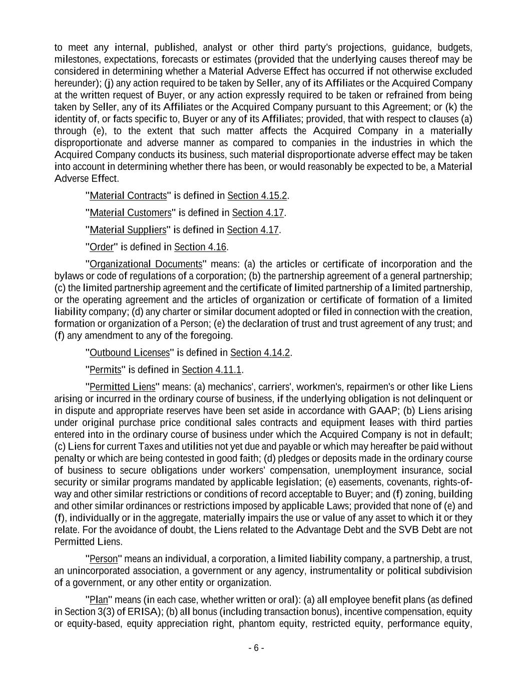 - 6 - to meet any internal, published, analyst or other third party's projections, guidance, budgets, milestones, expectations, forecasts or estimates (provided that the underlying causes thereof may be considered in determining whether a Material Adverse Effect has occurred if not otherwise excluded hereunder); (j) any action required to be taken by Seller, any of its Affiliates or the Acquired Company at the written request of Buyer, or any action expressly required to be taken or refrained from being taken by Seller, any of its Affiliates or the Acquired Company pursuant to this Agreement; or (k) the identity of, or facts specific to, Buyer or any of its Affiliates; provided, that with respect to clauses (a) through (e), to the extent that such matter affects the Acquired Company in a materially disproportionate and adverse manner as compared to companies in the industries in which the Acquired Company conducts its business, such material disproportionate adverse effect may be taken into account in determining whether there has been, or would reasonably be expected to be, a Material Adverse Effect. "Material Contracts" is defined in Section 4.15.2. "Material Customers" is defined in Section 4.17. "Material Suppliers" is defined in Section 4.17. "Order" is defined in Section 4.16. "Organizational Documents" means: (a) the articles or certificate of incorporation and the bylaws or code of regulations of a corporation; (b) the partnership agreement of a general partnership; (c) the limited partnership agreement and the certificate of limited partnership of a limited partnership, or the operating agreement and the articles of organization or certificate of formation of a limited liability company; (d) any charter or similar document adopted or filed in connection with the creation, formation or organization of a Person; (e) the declaration of trust and trust agreement of any trust; and (f) any amendment to any of the foregoing. "Outbound Licenses" is defined in Section 4.14.2. "Permits" is defined in Section 4.11.1. "Permitted Liens" means: (a) mechanics', carriers', workmen's, repairmen's or other like Liens arising or incurred in the ordinary course of business, if the underlying obligation is not delinquent or in dispute and appropriate reserves have been set aside in accordance with GAAP; (b) Liens arising under original purchase price conditional sales contracts and equipment leases with third parties entered into in the ordinary course of business under which the Acquired Company is not in default; (c) Liens for current Taxes and utilities not yet due and payable or which may hereafter be paid without penalty or which are being contested in good faith; (d) pledges or deposits made in the ordinary course of business to secure obligations under workers' compensation, unemployment insurance, social security or similar programs mandated by applicable legislation; (e) easements, covenants, rights-of- way and other similar restrictions or conditions of record acceptable to Buyer; and (f) zoning, building and other similar ordinances or restrictions imposed by applicable Laws; provided that none of (e) and (f), individually or in the aggregate, materially impairs the use or value of any asset to which it or they relate. For the avoidance of doubt, the Liens related to the Advantage Debt and the SVB Debt are not Permitted Liens. "Person" means an individual, a corporation, a limited liability company, a partnership, a trust, an unincorporated association, a government or any agency, instrumentality or political subdivision of a government, or any other entity or organization. "Plan" means (in each case, whether written or oral): (a) all employee benefit plans (as defined in Section 3(3) of ERISA); (b) all bonus (including transaction bonus), incentive compensation, equity or equity-based, equity appreciation right, phantom equity, restricted equity, performance equity,