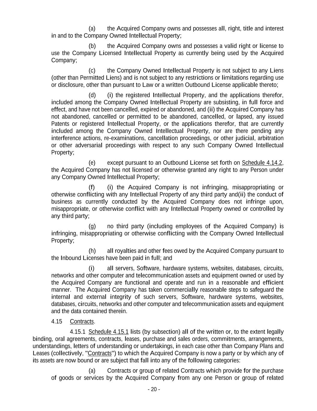 - 20 - (a) the Acquired Company owns and possesses all, right, title and interest in and to the Company Owned Intellectual Property; (b) the Acquired Company owns and possesses a valid right or license to use the Company Licensed Intellectual Property as currently being used by the Acquired Company; (c) the Company Owned Intellectual Property is not subject to any Liens (other than Permitted Liens) and is not subject to any restrictions or limitations regarding use or disclosure, other than pursuant to Law or a written Outbound License applicable thereto; (d) (i) the registered Intellectual Property, and the applications therefor, included among the Company Owned Intellectual Property are subsisting, in full force and effect, and have not been cancelled, expired or abandoned, and (ii) the Acquired Company has not abandoned, cancelled or permitted to be abandoned, cancelled, or lapsed, any issued Patents or registered Intellectual Property, or the applications therefor, that are currently included among the Company Owned Intellectual Property, nor are there pending any interference actions, re-examinations, cancellation proceedings, or other judicial, arbitration or other adversarial proceedings with respect to any such Company Owned Intellectual Property; (e) except pursuant to an Outbound License set forth on Schedule 4.14.2, the Acquired Company has not licensed or otherwise granted any right to any Person under any Company Owned Intellectual Property; (f) (i) the Acquired Company is not infringing, misappropriating or otherwise conflicting with any Intellectual Property of any third party and(ii) the conduct of business as currently conducted by the Acquired Company does not infringe upon, misappropriate, or otherwise conflict with any Intellectual Property owned or controlled by any third party; (g) no third party (including employees of the Acquired Company) is infringing, misappropriating or otherwise conflicting with the Company Owned Intellectual Property; (h) all royalties and other fees owed by the Acquired Company pursuant to the Inbound Licenses have been paid in full; and (i) all servers, Software, hardware systems, websites, databases, circuits, networks and other computer and telecommunication assets and equipment owned or used by the Acquired Company are functional and operate and run in a reasonable and efficient manner. The Acquired Company has taken commercially reasonable steps to safeguard the internal and external integrity of such servers, Software, hardware systems, websites, databases, circuits, networks and other computer and telecommunication assets and equipment and the data contained therein. 4.15 Contracts. 4.15.1 Schedule 4.15.1 lists (by subsection) all of the written or, to the extent legally binding, oral agreements, contracts, leases, purchase and sales orders, commitments, arrangements, understandings, letters of understanding or undertakings, in each case other than Company Plans and Leases (collectively, "Contracts") to which the Acquired Company is now a party or by which any of its assets are now bound or are subject that fall into any of the following categories: (a) Contracts or group of related Contracts which provide for the purchase of goods or services by the Acquired Company from any one Person or group of related
