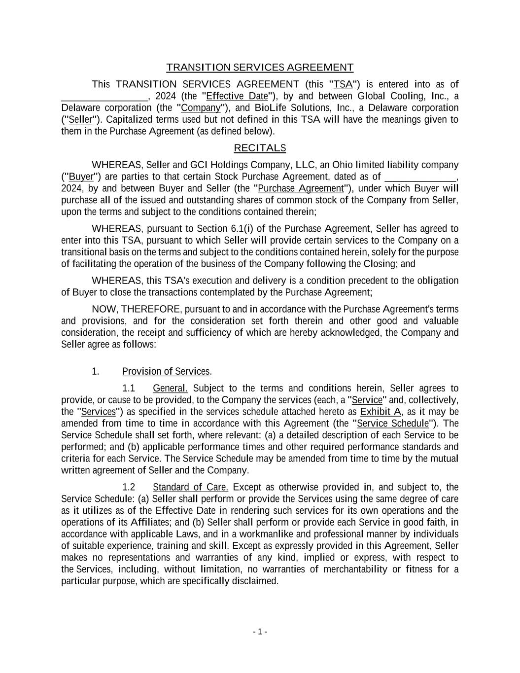 - 1 - TRANSITION SERVICES AGREEMENT This TRANSITION SERVICES AGREEMENT (this "TSA") is entered into as of _________________, 2024 (the "Effective Date"), by and between Global Cooling, Inc., a Delaware corporation (the "Company"), and BioLife Solutions, Inc., a Delaware corporation ("Seller"). Capitalized terms used but not defined in this TSA will have the meanings given to them in the Purchase Agreement (as defined below). RECITALS WHEREAS, Seller and GCI Holdings Company, LLC, an Ohio limited liability company ("Buyer") are parties to that certain Stock Purchase Agreement, dated as of ______________, 2024, by and between Buyer and Seller (the "Purchase Agreement"), under which Buyer will purchase all of the issued and outstanding shares of common stock of the Company from Seller, upon the terms and subject to the conditions contained therein; WHEREAS, pursuant to Section 6.1(i) of the Purchase Agreement, Seller has agreed to enter into this TSA, pursuant to which Seller will provide certain services to the Company on a transitional basis on the terms and subject to the conditions contained herein, solely for the purpose of facilitating the operation of the business of the Company following the Closing; and WHEREAS, this TSA's execution and delivery is a condition precedent to the obligation of Buyer to close the transactions contemplated by the Purchase Agreement; NOW, THEREFORE, pursuant to and in accordance with the Purchase Agreement's terms and provisions, and for the consideration set forth therein and other good and valuable consideration, the receipt and sufficiency of which are hereby acknowledged, the Company and Seller agree as follows: 1. Provision of Services. 1.1 General. Subject to the terms and conditions herein, Seller agrees to provide, or cause to be provided, to the Company the services (each, a "Service" and, collectively, the "Services") as specified in the services schedule attached hereto as Exhibit A, as it may be amended from time to time in accordance with this Agreement (the "Service Schedule"). The Service Schedule shall set forth, where relevant: (a) a detailed description of each Service to be performed; and (b) applicable performance times and other required performance standards and criteria for each Service. The Service Schedule may be amended from time to time by the mutual written agreement of Seller and the Company. 1.2 Standard of Care. Except as otherwise provided in, and subject to, the Service Schedule: (a) Seller shall perform or provide the Services using the same degree of care as it utilizes as of the Effective Date in rendering such services for its own operations and the operations of its Affiliates; and (b) Seller shall perform or provide each Service in good faith, in accordance with applicable Laws, and in a workmanlike and professional manner by individuals of suitable experience, training and skill. Except as expressly provided in this Agreement, Seller makes no representations and warranties of any kind, implied or express, with respect to the Services, including, without limitation, no warranties of merchantability or fitness for a particular purpose, which are specifically disclaimed.
