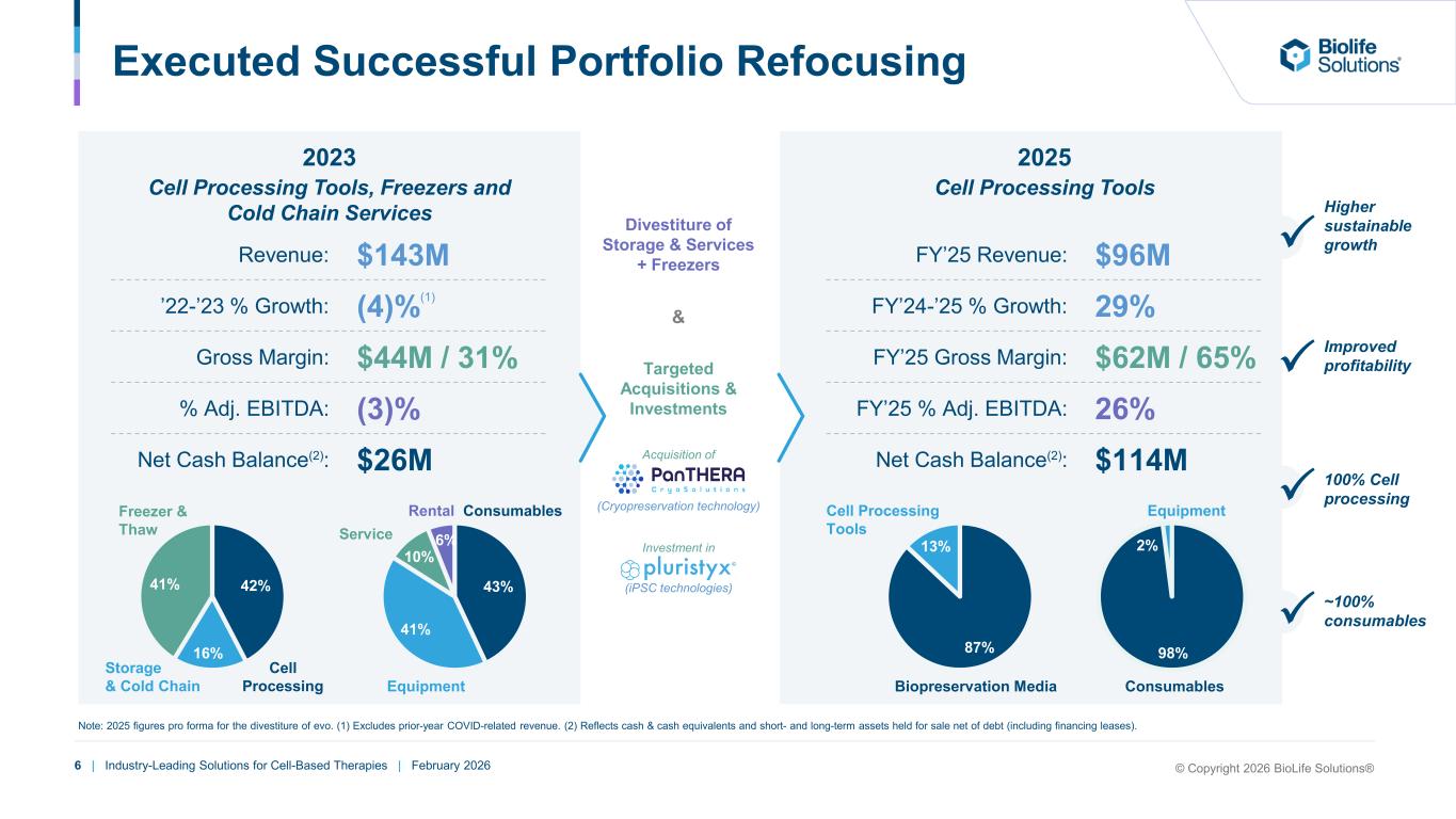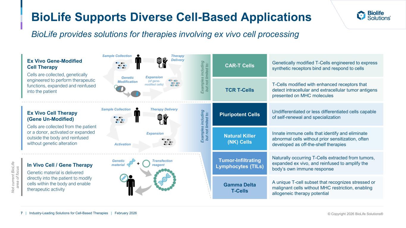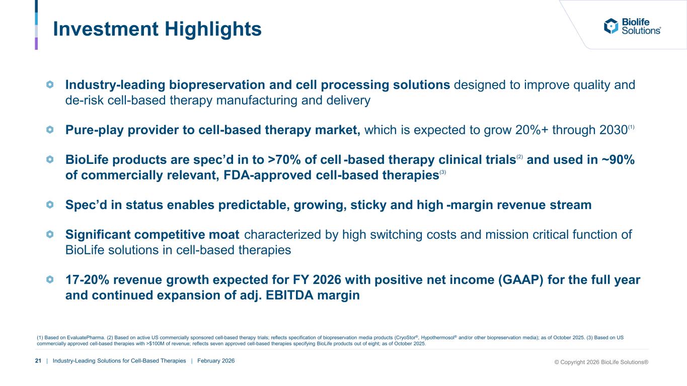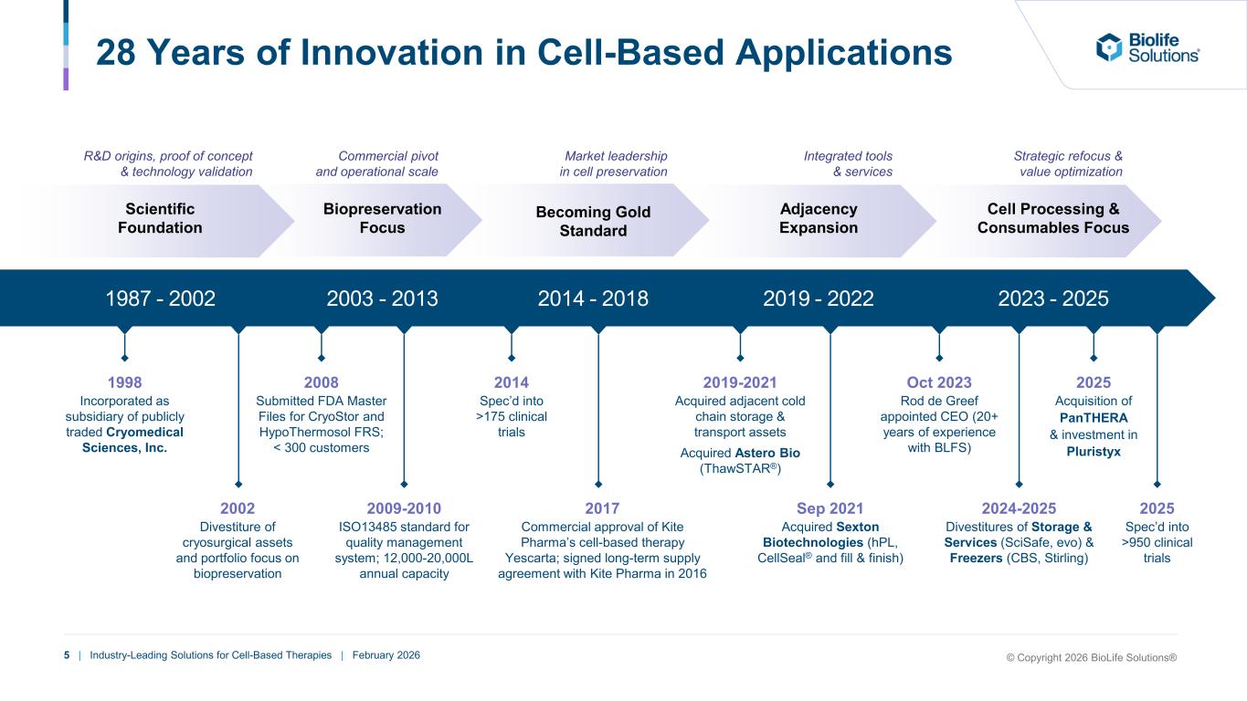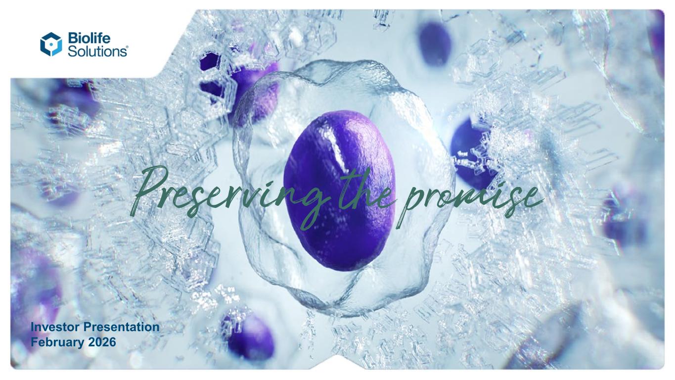 2 | Industry-Leading Solutions for Cell-Based Therapies | February 2026 © Copyright 2026 BioLife Solutions® Safe Harbor Statement Certain statements contained in this presentation are not historical facts and may be forward- looking statements within the meaning of the Private Securities Litigation Reform Act of 1995. Words such as “plans,” “expects,” “believes,” “anticipates,” “designed,” and similar words are intended to identify forward-looking statements. Forward-looking statements are based on our current expectations and beliefs, and involve a number of risks and uncertainties that are difficult to predict and that could cause actual results to differ materially from those stated or implied by the forward-looking statements. A description of certain of these risks, uncertainties and other matters can be found in filings we make with the U.S. Securities and Exchange Commission, all of which are available at www.sec.gov. Because forward-looking statements involve risks and uncertainties, actual results and events may differ materially from results and events currently expected by us. Readers are cautioned not to place undue reliance on these forward-looking statements, which speak only as of the date of this presentation. We undertake no obligation to publicly update these forward-looking statements to reflect events or circumstances that occur after the date of this presentation or to reflect any change in its expectations with regard to these forward-looking statements or the occurrence of unanticipated events. This presentation contains industry, statistical and market data, which was obtained from the company’s own internal estimates and research as well as from industry and general publications and research, surveys and studies conducted by third parties. All of the market data used in this presentation involves a number of assumptions and limitations. While the company believes that the information from these industry publications, surveys and studies is reliable, the industry in which it operates is subject to a high degree of uncertainty and risk due to a variety of important factors. These and other factors could cause results to differ materially from those expressed in the estimates made by third parties and by the company. This presentation contains trademarks, trade names and service marks of other companies, which are the property of their respective owners. The company does not intend its use or display of other parties' trademarks, trade names or service marks to imply, and such use or display should not be construed to imply, a relationship with, or endorsement or sponsorship of the company by, these other parties. Non-GAAP Measures of Financial Performance: To supplement our financial statements, which are presented on the basis of U.S. generally accepted accounting principles (GAAP), the following non-GAAP measures of financial performance are included on a consolidated basis in this release: adjusted gross margin, earnings before interest, taxes, depreciation and amortization (EBITDA), and adjusted EBITDA from continuing operations. A reconciliation of GAAP to adjusted non-GAAP financial measures is included on slides 24 – 27 of this presentation. We believe these non-GAAP financial measures are useful to investors in assessing our operating performance. We use these financial measures internally to evaluate our operating performance and for planning and forecasting of future periods. We also believe it is in the best interests of investors to provide this non-GAAP information. While we believe these non-GAAP financial measures provide useful supplemental information to investors, there are limitations associated with the use of these non-GAAP financial measures. These non-GAAP financial measures may not be reported by competitors, and they may not be directly comparable to similarly titled measures of other companies due to differences in calculation methodologies. The non-GAAP financial measures are not an alternative to GAAP information and are not meant to be considered in isolation or as a substitute for comparable GAAP financial measures. They should be used only as a supplement to GAAP information and should be considered only in conjunction with our consolidated financial statements prepared in accordance with GAAP.