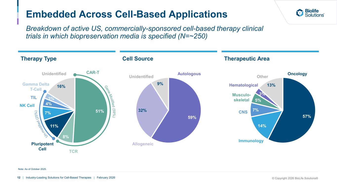 12 | Industry-Leading Solutions for Cell-Based Therapies | February 2026 Embedded Across Cell-Based Applications Therapy Type Cell Source Therapeutic Area Breakdown of active US, commercially-sponsored cell-based therapy clinical trials in which biopreservation media is specified (N=~250) 59% 32% 9% 57% 14% 7% 5% 3% 13% Unidentified Allogeneic 51% 8% 11% 7% 4% 3% 16% Note: As of October 2025. Musculo- skeletal Other CNS Immunology Hematological CAR-T TCR Pluripotent Cell Gamma Delta T-Cell Unidentified TIL NK Cell Autologous Oncology © Copyright 2026 BioLife Solutions®