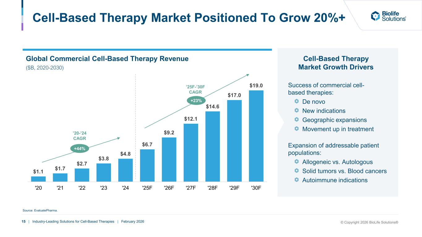 15 | Industry-Leading Solutions for Cell-Based Therapies | February 2026 +12% ‘25-’30 CAGR 23K 30K 50K33K Global Number of Cell-Based Therapy Patients (Clinical & Commercial) 34K 42K 59K 68K 74K 81K 89K $1.1 $1.7 $2.7 $3.8 $4.8 $6.7 $9.2 $12.1 $14.6 $17.0 $19.0 '20 '21 '22 '23 ' 4 '25F '26F '27F '28F '29F '30F Cell-Based Therapy Market Positioned To Grow 20%+ Success of commercial cell- based therapies: De novo New indications Geographic expansions Movement up in treatment Cell-Based Therapy Market Growth Drivers Global Commercial Cell-Based Therapy Revenue ($B, 2020-2030) Expansion of addressable patient populations: Allogeneic vs. Autologous Solid tumors vs. Blood cancers Autoimmune indications Source: EvaluatePharma. ’25F-’30F CAGR +23% +44% ’20-’24 CAGR © Copyright 2026 BioLife Solutions®