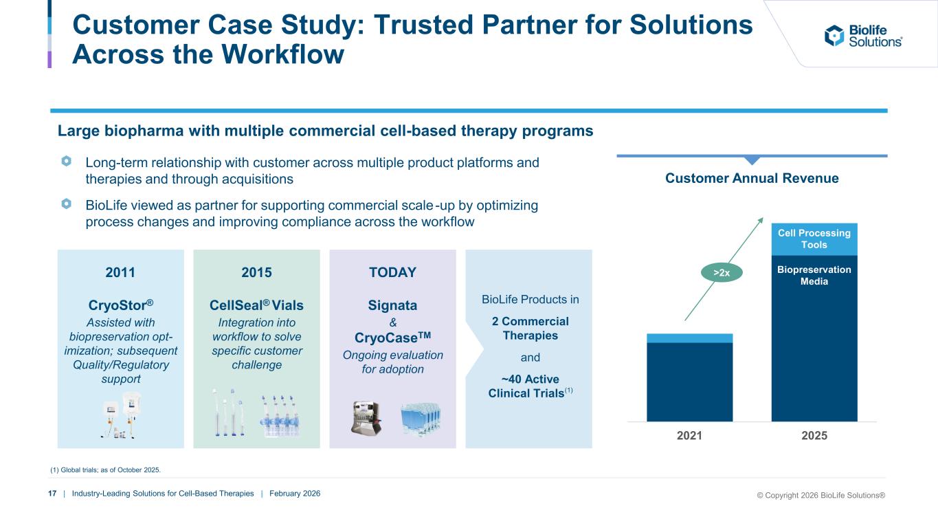 13 | Industry-Leading Solutions for Cell-Based Therapies | February 2026 CryoStor®: Industry-Leading Cryopreservation Solution in a Market with High Switching Costs CryoStor® Differentiation Obstacles to Switch by Phase Performance (Cell Viability) Regulatory Documentation Technical Support Supply Consistency & Reliability Source: Advancy and Dark Horse Consulting. Clinical precedent and regulatory acceptance with brand recognition and customer trust Master File and US FDA cross-references, cGMP evidence and full traceability, closed system-packaging for use in clinical and commercial applications Pre-Clinical $100k - $500k $300k - $1.7m $300k - $1.7m $3m - $6m $3m - $6m 3-6mo 12-24mo 12-24mo 2-4yr 2-4yr Phase I Phase II Phase III Manufacturing Phase Ability to Switch Est. Cost Est. Time Easier to SwitchHarder to Switch Reliably high post-thaw recovery and functional viability across a wide range of cell types and consistently outperforms top competitors and generic cryopreservation media Availability of experienced regulatory support and scientific and technical assistance for troubleshooting and integration of the product into cryopreservation workflows and navigation of global regulatory pathways Strong logistics and supply stability ensuring consistency of lot-to-lot, on time delivery, and validated cold-chain for global distribution Reputation © Copyright 2026 BioLife Solutions®