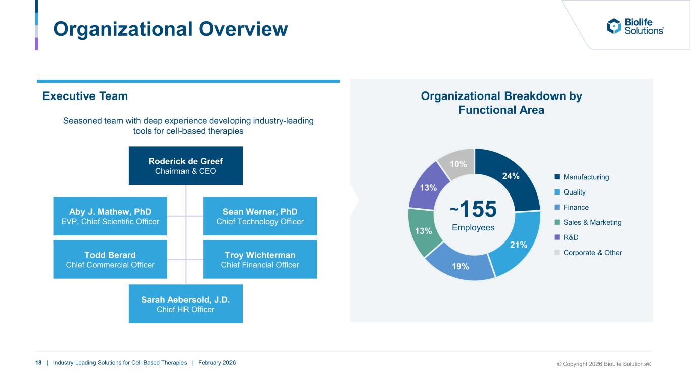© Copyright 2026 BioLife Solutions® BioLife Solutions Inc. 3303 Monte Villa Parkway, Suite 310 Bothell, WA 98021 USA T +1.866.424.6543 or 425.402.1400 F +1.425.402.1433 E info@biolifesolutions.com biolifesolutions.com NASDAQ: BLFS For additional questions or comments Roderick De Greef | Chief Executive Officer rdegreef@BioLifeSolutions.com | (425) 686-6003 Troy Wichterman | Chief Financial Officer twichterman@BioLifeSolutions.com | (425) 402-1400