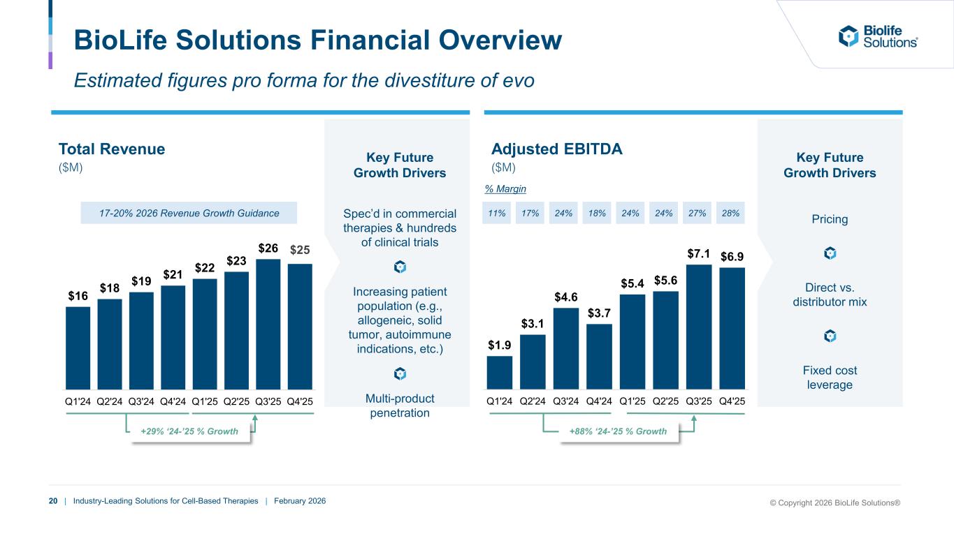 24 | Industry-Leading Solutions for Cell-Based Therapies | February 2026 GAAP Gross Profit to Non-GAAP Gross Profit Estimated figures pro forma for the divestiture of evo (In thousands) Q1 2024 Q2 2024 Q3 2024 Q4 2024 FY2024 Total revenues $ 16,485 $ 18,042 $ 19,405 $ 20,715 $ 74,647 Cost of revenues (4,961) (5,905) (5,888) (6,829) (23,583) COGS intangible asset amortization (246) (241) (240) (241) (968) Gross profit $ 11,278 $ 11,896 $ 13,277 $ 13,645 $ 50,096 Gross margin 68% 66% 68% 66% 67% ADJUSTMENTS TO GROSS PROFIT: Inventory reserve costs - - 247 - 247 Gain on disposal of assets - - - 87 87 Intangible asset amortization 246 241 240 241 968 ADJUSTED GROSS PROFIT $ 11,524 $ 12,137 $ 13,764 $ 13,973 $ 51,398 ADJUSTED GROSS MARGIN 70% 67% 71% 67% 69% © Copyright 2026 BioLife Solutions®