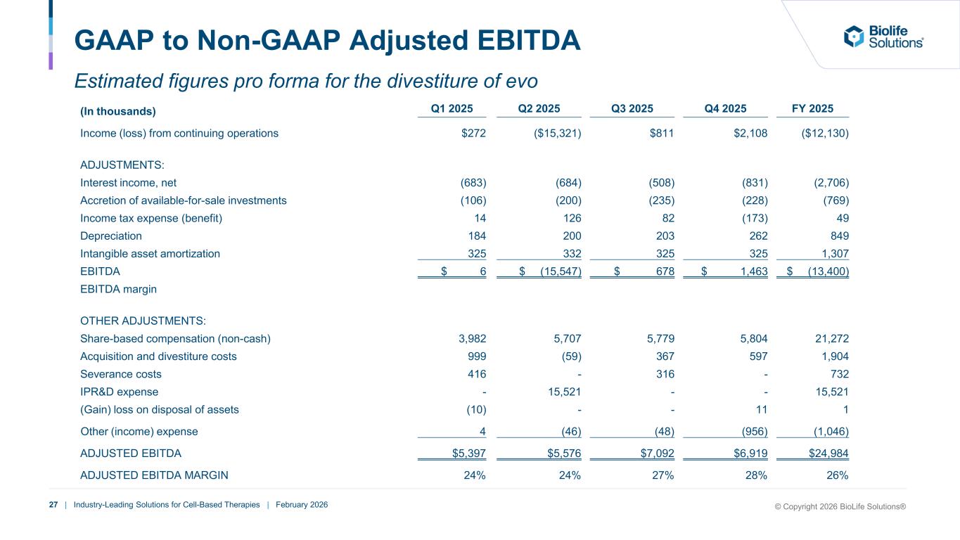 25 | Industry-Leading Solutions for Cell-Based Therapies | February 2026 GAAP Gross Profit to Non-GAAP Gross Profit Estimated figures pro forma for the divestiture of evo (In thousands) Q1 2025 Q2 2025 Q3 2025 Q4 2025 FY 2025 Total revenues $ 22,054 $ 23,438 $ 25,958 $ 24,764 $ 96,214 Cost of revenues (6,995) (7,937) (9,130) (8,989) (33,052) COGS intangible asset amortization (259) (267) (259) (259) (1,044) Gross profit $ 14,800 $ 15,234 $ 16,569 $ 15,516 $ 62,118 Gross margin 67% 65% 64% 63% 65% ADJUSTMENTS TO GROSS PROFIT: Gain on disposal of assets (12) - - - (12) Intangible asset amortization 259 267 259 259 1,044 ADJUSTED GROSS PROFIT $ 15,047 $ 15,501 $ 16,828 $ 15,775 $ 63,150 ADJUSTED GROSS MARGIN 68% 66% 65% 64% 66% © Copyright 2026 BioLife Solutions®