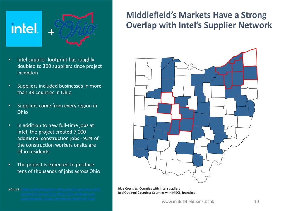 Historic Growth Underway in The Columbus Region Historic economic development is underway across Central Ohio, including (1) recently announced projects from Intel ($100 Billion), Amazon ($8.0 Billion), Honda ($4.5 Billion), and Nationwide Children’s Hospital ($3.3 Billion). Intel’s project alone is the largest single private-sector investment in Ohio’s history. Intel’s initial $20 billion investment into two new factories in Licking County could grow to as much as $100 billion by the time the buildout is complete, creating one of the largest semiconductor manufacturing sites in the world. The first phase of the project is expected to create 3,000 Intel jobs and (2) 7,000 construction jobs . The Columbus Region has experienced robust growth. From 2010 to 2020, the population of the city alone increased at a growth rate of more than 12%, which is substantially higher than the 2.1% average for the rest of the Midwest. The Columbus Region is expected to expand to 3 million people by (3) 2050 . Every job at Intel is expected to create 13 more jobs in other (1) industries, creating a total of 39,000 jobs in Central Ohio The Middlefield Banking Company has a strong and established presence throughout Central and Western Ohio. With 10 locations throughout Central and Western Ohio, The Middlefield Banking Company is one of the largest independent community banks in the region making it well The 10-county area in Central Ohio is home to over positioned to support the rapidly expanding financial needs of its surrounding communities. 2.2 million people and 16 Fortune 1000 company th headquarters. The Columbus region is the 14 largest (1) Sources: Betsy Liska Goldstein, “Intel on Intel” https://www.youtube.com/watch?v=9MO0wPg4CYw (3) (2) metropolis in the U.S. https://www.cleveland19.com/2022/09/09/intels-investment-ohio-could-have-100-billion-impact/ (3) https://columbusregion.com www.middlefieldbank.bank 9