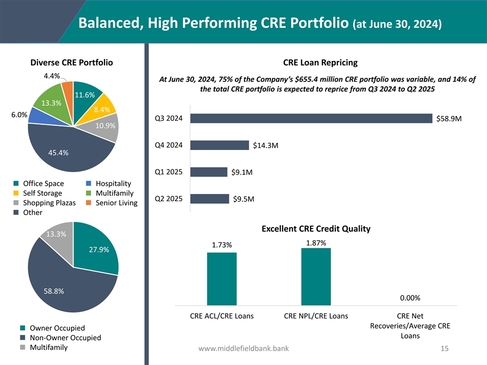 Excellent Asset Quality Overview (at June 30, 2024) Nonperforming Assets to Total Assets 1.10% Secured loans are subject to loan-to-value requirements based on 0.89% 0.87% collateral types 0.76% 0.63% 0.60% 0.47% CRE as a percent of the total loan portfolio was 43.7% 2018 2019 2020 2021 2022 2023 At June 30, 2024 Balanced and diverse CRE portfolio Net Charge-Offs (Recoveries) to Average Loans, Annualized 0.35% 0.29% 0.30% CRE office credit exposure represented 5.1% of the Company’s 0.25% total loan portfolio 0.20% 0.16% 0.15% 0.10% 0.06% Nonperforming loans at June 30, 2024, included two relationships 0.05% in the freight and industrial segments that moved to nonaccrual in 0.00% -0.01% -0.01% -0.02% the second quarter. This is believed to not be indicative of a trend 0.00% in Middlefield's markets served, portfolio, or underwriting -0.05% standards 2018 2019 2020 2021 2022 2023 2024 YTD www.middlefieldbank.bank 14