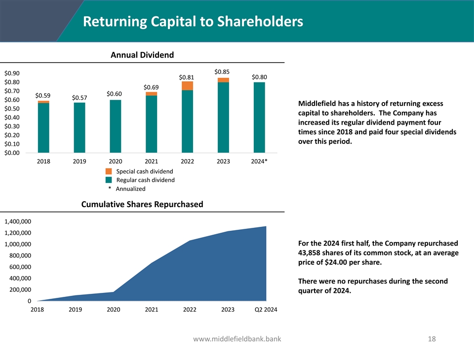 Successful Acquisition Strategy and Organic Growth: Total Assets Have Grown at a 12.7% CAGR From 2016 -2023 The December 2022 Liberty Bancshares, Inc. acquisition extended Middlefield’s reach in Western and Central Ohio and into Hardin and Logan Counties The January 2017 Liberty Bank, N.A. acquisition extended Middlefield’s $2,000,000 reach in Northeast Ohio and into Cuyahoga and Summit Counties $1,800,000 $1,600,000 $1,400,000 $1,200,000 $1,000,000 $800,000 $600,000 $400,000 $200,000 $- 2016 2017 2018 2019 2020 2021 2022 2023 At June 30, 2024 Total Assets www.middlefieldbank.bank 17
