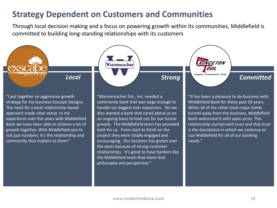 Strategy Dependent on Customers and Communities Through local decision making and a focus on powering growth within its communities, Middlefield is committed to building long-standing relationships with its customers Local Strong Committed “I put together an aggressive growth “Wannemacher Ent., Inc. needed a “It has been a pleasure to do business with strategy for my business Exscape Designs. community bank that was large enough to Middlefield Bank for these past 20 years. The need for a local relationship-based handle our biggest ever expansion. Yet we When all of the other local major banks approach made clear sense. In my also wanted a bank that cared about us on turned away from the business, Middlefield experience over the years with Middlefield an ongoing basis to look out for our future Bank welcomed it with open arms. This Bank we have been able to achieve a lot of growth. The Middlefield team has provided relationship started with trust and that trust growth together. With Middlefield you're both for us. From start to finish on the is the foundation in which we continue to not just numbers, it's the relationship and project they were totally engaged and use Middlefield for all of our banking community that matters to them.” encouraging. Our business has grown over needs.” the years because of strong customer relationships. It’s great to have bankers like the Middlefield team that share that philosophy and perspective.” www.middlefieldbank.bank 19