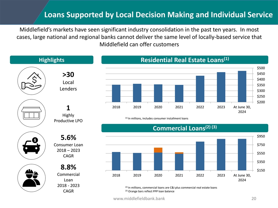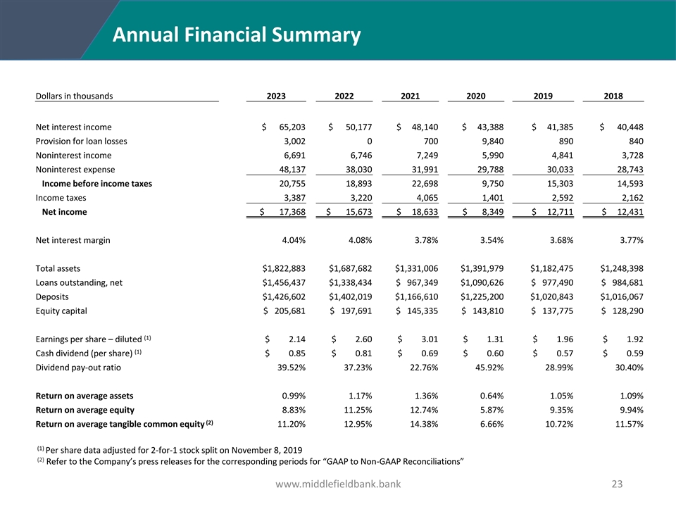Annual Financial Summary Dollars in thousands 2023 2022 2021 2020 2019 2018 Net interest income $ 65,203 $ 50,177 $ 48,140 $ 43,388 $ 41,385 $ 40,448 Provision for loan losses 3,002 0 700 9,840 890 840 Noninterest income 6,691 6,746 7,249 5,990 4,841 3,728 Noninterest expense 48,137 38,030 31,991 29,788 30,033 28,743 Income before income taxes 20,755 18,893 22,698 9,750 15,303 14,593 Income taxes 3,387 3,220 4,065 1,401 2,592 2,162 Net income $ 17,368 $ 15,673 $ 18,633 $ 8,349 $ 12,711 $ 12,431 Net interest margin 4.04% 4.08% 3.78% 3.54% 3.68% 3.77% Total assets $1,822,883 $1,687,682 $1,331,006 $1,391,979 $1,182,475 $1,248,398 Loans outstanding, net $1,456,437 $1,338,434 $ 967,349 $1,090,626 $ 977,490 $ 984,681 Deposits $1,426,602 $1,402,019 $1,166,610 $1,225,200 $1,020,843 $1,016,067 Equity capital $ 205,681 $ 197,691 $ 145,335 $ 143,810 $ 137,775 $ 128,290 (1) Earnings per share – diluted $ 2.14 $ 2.60 $ 3.01 $ 1.31 $ 1.96 $ 1.92 (1) Cash dividend (per share) $ 0.85 $ 0.81 $ 0.69 $ 0.60 $ 0.57 $ 0.59 Dividend pay-out ratio 39.52% 37.23% 22.76% 45.92% 28.99% 30.40% Return on average assets 0.99% 1.17% 1.36% 0.64% 1.05% 1.09% Return on average equity 8.83% 11.25% 12.74% 5.87% 9.35% 9.94% (2) Return on average tangible common equity 11.20% 12.95% 14.38% 6.66% 10.72% 11.57% (1) Per share data adjusted for 2-for-1 stock split on November 8, 2019 (2) Refer to the Company’s press releases for the corresponding periods for “GAAP to Non-GAAP Reconciliations” www.middlefieldbank.bank 23