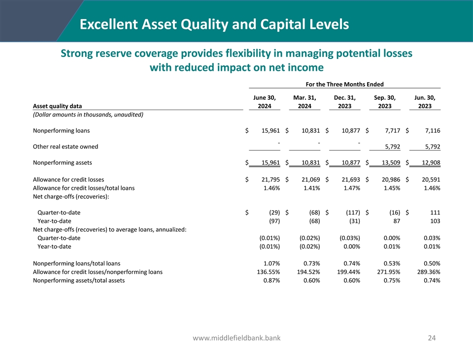 Excellent Asset Quality and Capital Levels Strong reserve coverage provides flexibility in managing potential losses with reduced impact on net income For the Three Months Ended June 30, Mar. 31, Dec. 31, Sep. 30, Jun. 30, Asset quality data 2024 2024 2023 2023 2023 (Dollar amounts in thousands, unaudited) Nonperforming loans $ 15,961 $ 10,831 $ 10,877 $ 7,717 $ 7,116 - - - Other real estate owned 5,792 5,792 Nonperforming assets $ 15,961 $ 10,831 $ 10,877 $ 13,509 $ 12,908 Allowance for credit losses $ 21,795 $ 21,069 $ 21,693 $ 20,986 $ 20,591 Allowance for credit losses/total loans 1.46% 1.41% 1.47% 1.45% 1.46% Net charge-offs (recoveries): Quarter-to-date $ (29) $ (68) $ (117) $ (16) $ 111 Year-to-date (97) (68) (31) 87 103 Net charge-offs (recoveries) to average loans, annualized: Quarter-to-date (0.01%) (0.02%) (0.03%) 0.00% 0.03% Year-to-date (0.01%) (0.02%) 0.00% 0.01% 0.01% Nonperforming loans/total loans 1.07% 0.73% 0.74% 0.53% 0.50% Allowance for credit losses/nonperforming loans 136.55% 194.52% 199.44% 271.95% 289.36% Nonperforming assets/total assets 0.87% 0.60% 0.60% 0.75% 0.74% www.middlefieldbank.bank 24