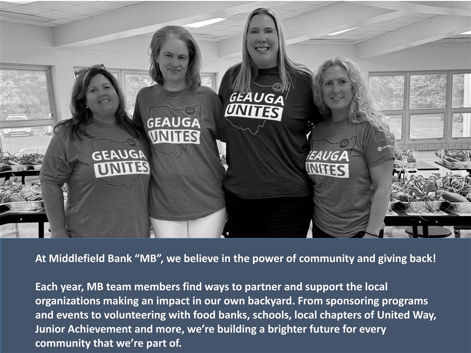 Middlefield Banc Corp. (Nasdaq: MBCN) Providing financial services throughout Central, Western and Northeast Ohio Profitably serving its communities, customers, employees, and shareholders by its At Middlefield Bank “MB”, we believe in the power of community and giving back! commitment to quality, safety and soundness, and maximizing shareholder value Each year, MB team members find ways to partner and support the local organizations making an impact in our own backyard. From sponsoring programs and events to volunteering with food banks, schools, local chapters of United Way, Junior Achievement and more, we’re building a brighter future for every www.middlefieldbank.bank 4 4 community that we’re part of.