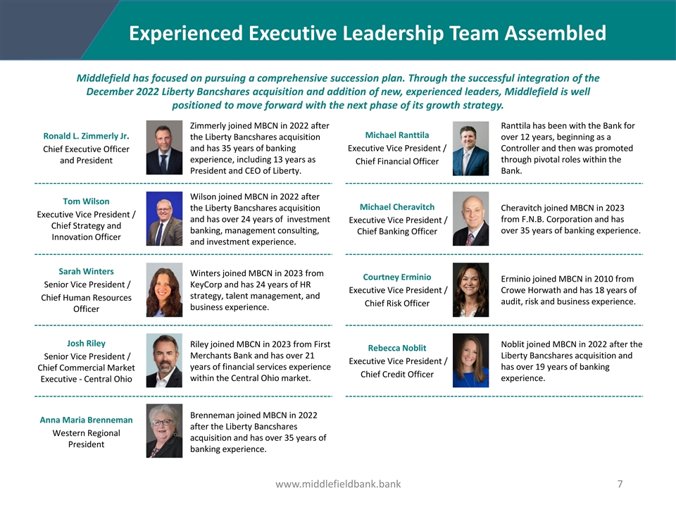 Experienced Executive Leadership Team Assembled Middlefield has focused on pursuing a comprehensive succession plan. Through the successful integration of the December 2022 Liberty Bancshares acquisition and addition of new, experienced leaders, Middlefield is well positioned to move forward with the next phase of its growth strategy. Zimmerly joined MBCN in 2022 after Ranttila has been with the Bank for Michael Ranttila Ronald L. Zimmerly Jr. the Liberty Bancshares acquisition over 12 years, beginning as a and has 35 years of banking Executive Vice President / Controller and then was promoted Chief Executive Officer experience, including 13 years as through pivotal roles within the and President Chief Financial Officer President and CEO of Liberty. Bank. Wilson joined MBCN in 2022 after Tom Wilson Michael Cheravitch the Liberty Bancshares acquisition Cheravitch joined MBCN in 2023 Executive Vice President / and has over 24 years of investment from F.N.B. Corporation and has Executive Vice President / Chief Strategy and banking, management consulting, over 35 years of banking experience. Chief Banking Officer Innovation Officer and investment experience. Sarah Winters Winters joined MBCN in 2023 from Courtney Erminio Erminio joined MBCN in 2010 from Senior Vice President / KeyCorp and has 24 years of HR Executive Vice President / Crowe Horwath and has 18 years of strategy, talent management, and Chief Human Resources audit, risk and business experience. Chief Risk Officer business experience. Officer Josh Riley Riley joined MBCN in 2023 from First Noblit joined MBCN in 2022 after the Rebecca Noblit Merchants Bank and has over 21 Liberty Bancshares acquisition and Senior Vice President / Executive Vice President / years of financial services experience has over 19 years of banking Chief Commercial Market Chief Credit Officer within the Central Ohio market. experience. Executive - Central Ohio Brenneman joined MBCN in 2022 Anna Maria Brenneman after the Liberty Bancshares Western Regional acquisition and has over 35 years of President banking experience. www.middlefieldbank.bank 7