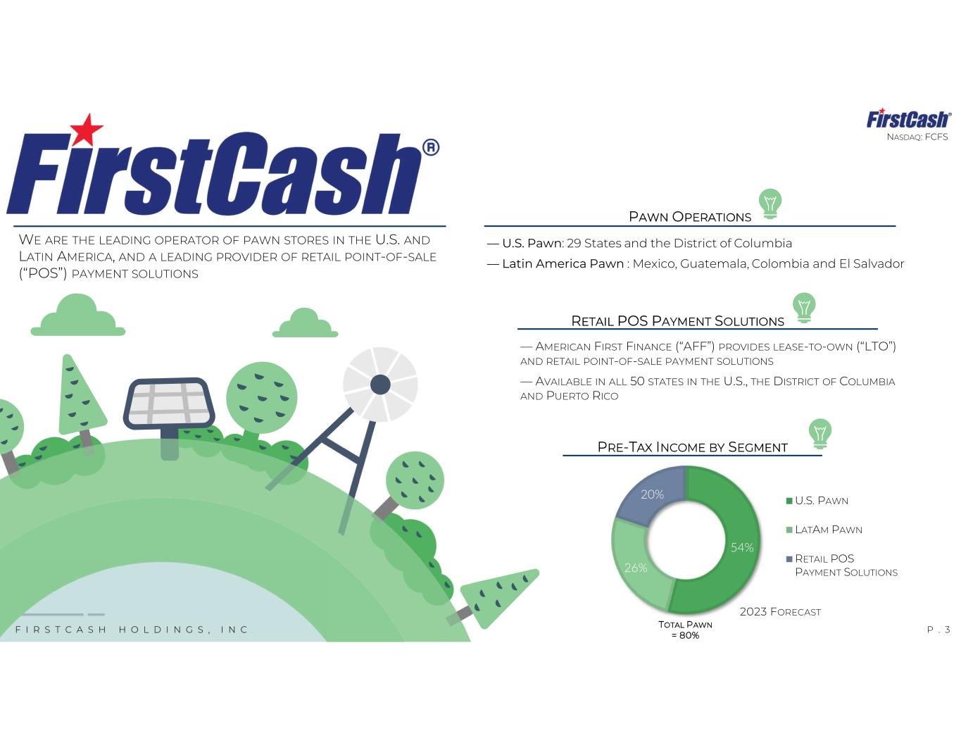 P . 2F I R S T C A S H H O L D I N G S , I N C . NASDAQ: FCFS THIS PRESENTATION CONTAINS FORWARD-LOOKING STATEMENTS ABOUT THE BUSINESS, FINANCIAL CONDITION, OUTLOOK AND PROSPECTS OF FIRSTCASH HOLDINGS, INC. AND ITS WHOLLY OWNED SUBSIDIARIES (TOGETHER, THE “COMPANY”). FORWARD-LOOKING STATEMENTS, AS THAT TERM IS DEFINED IN THE PRIVATE SECURITIES LITIGATION REFORM ACT OF 1995, CAN BE IDENTIFIED BY THE USE OF FORWARD-LOOKING TERMINOLOGY SUCH AS “BELIEVES,” “PROJECTS,” “EXPECTS,” “MAY,” “ESTIMATES,” “SHOULD,” “PLANS,” “TARGETS,” “INTENDS,” “COULD,” “WOULD,” “ANTICIPATES,” “POTENTIAL,” “CONFIDENT,” “OPTIMISTIC” OR THE NEGATIVE THEREOF, OR OTHER VARIATIONS THEREON, OR COMPARABLE TERMINOLOGY, OR BY DISCUSSIONS OF STRATEGY, OBJECTIVES, ESTIMATES, GUIDANCE, EXPECTATIONS, OUTLOOK AND FUTURE PLANS. FORWARD-LOOKING STATEMENTS CAN ALSO BE IDENTIFIED BY THE FACT THESE STATEMENTS DO NOT RELATE STRICTLY TO HISTORICAL OR CURRENT MATTERS. RATHER, FORWARD-LOOKING STATEMENTS RELATE TO ANTICIPATED OR EXPECTED EVENTS, ACTIVITIES, TRENDS OR RESULTS. BECAUSE FORWARD-LOOKING STATEMENTS RELATE TO MATTERS THAT HAVE NOT YET OCCURRED, THESE STATEMENTS ARE INHERENTLY SUBJECT TO RISKS AND UNCERTAINTIES. WHILE THE COMPANY BELIEVES THE EXPECTATIONS REFLECTED IN FORWARD-LOOKING STATEMENTS ARE REASONABLE, THERE CAN BE NO ASSURANCES SUCH EXPECTATIONS WILL PROVE TO BE ACCURATE. SECURITY HOLDERS ARE CAUTIONED THAT SUCH FORWARD- LOOKING STATEMENTS INVOLVE RISKS AND UNCERTAINTIES. CERTAIN FACTORS MAY CAUSE RESULTS TO DIFFER MATERIALLY FROM THOSE ANTICIPATED BY THE FORWARD-LOOKING STATEMENTS MADE IN THIS PRESENTATION. SUCH FACTORS MAY INCLUDE, WITHOUT LIMITATION, RISKS RELATED TO THE EXTENSIVE REGULATORY ENVIRONMENT IN WHICH THE COMPANY OPERATES; RISKS ASSOCIATED WITH THE LEGAL AND REGULATORY PROCEEDINGS THAT THE COMPANY IS A PARTY TO, OR MAY BECOME A PARTY TO IN THE FUTURE, INCLUDING THE CONSUMER FINANCIAL PROTECTION BUREAU (THE “CFPB”) LAWSUIT FILED AGAINST THE COMPANY; RISKS RELATED TO THE COMPANY’S ACQUISITIONS, INCLUDING THE FAILURE OF THE COMPANY’S ACQUISITIONS, TO DELIVER THE ESTIMATED VALUE AND BENEFITS EXPECTED BY THE COMPANY AND THE ABILITY OF THE COMPANY TO CONTINUE TO IDENTIFY AND CONSUMMATE ACQUISITIONS ON FAVORABLE TERMS; POTENTIAL CHANGES IN CONSUMER BEHAVIOR AND SHOPPING PATTERNS WHICH COULD IMPACT DEMAND FOR THE COMPANY’S PAWN LOAN, RETAIL, LEASE-TO-OWN (“LTO”) AND RETAIL FINANCE PRODUCTS, INCLUDING, AS A RESULT TO, CHANGES IN THE GENERAL ECONOMIC CONDITIONS; LABOR SHORTAGES AND INCREASED LABOR COSTS; A DETERIORATION IN THE ECONOMIC CONDITIONS IN THE UNITED STATES AND LATIN AMERICA, INCLUDING AS A RESULT OF INFLATION AND RISING INTEREST RATES, WHICH POTENTIALLY COULD HAVE AN IMPACT ON DISCRETIONARY CONSUMER SPENDING AND DEMAND FOR THE COMPANY’S PRODUCTS; CURRENCY FLUCTUATIONS, PRIMARILY INVOLVING THE MEXICAN PESO; COMPETITION THE COMPANY FACES FROM OTHER RETAILERS AND PROVIDERS OF RETAIL PAYMENT SOLUTIONS; THE ABILITY OF THE COMPANY TO SUCCESSFULLY EXECUTE ON ITS BUSINESS STRATEGIES; AND OTHER RISKS DISCUSSED AND DESCRIBED IN THE COMPANY’S MOST RECENT ANNUAL REPORT ON FORM 10-K FILED WITH THE SECURITIES AND EXCHANGE COMMISSION (THE “SEC”), INCLUDING THE RISKS DESCRIBED IN PART 1, ITEM 1A, “RISK FACTORS” THEREOF, AND OTHER REPORTS FILED WITH THE SEC. MANY OF THESE RISKS AND UNCERTAINTIES ARE BEYOND THE ABILITY OF THE COMPANY TO CONTROL, NOR CAN THE COMPANY PREDICT, IN MANY CASES, ALL OF THE RISKS AND UNCERTAINTIES THAT COULD CAUSE ITS ACTUAL RESULTS TO DIFFER MATERIALLY FROM THOSE INDICATED BY THE FORWARD-LOOKING STATEMENTS. THE FORWARD-LOOKING STATEMENTS CONTAINED IN THIS PRESENTATION SPEAK ONLY AS OF THE DATE OF THIS PRESENTATION, AND THE COMPANY EXPRESSLY DISCLAIMS ANY OBLIGATION OR UNDERTAKING TO REPORT ANY UPDATES OR REVISIONS TO ANY SUCH STATEMENT TO REFLECT ANY CHANGE IN THE COMPANY’S EXPECTATIONS OR ANY CHANGE IN EVENTS, CONDITIONS OR CIRCUMSTANCES ON WHICH ANY SUCH STATEMENT IS BASED, EXCEPT AS REQUIRED BY LAW. Cautionary Statement Regarding Forward-Looking Statements
