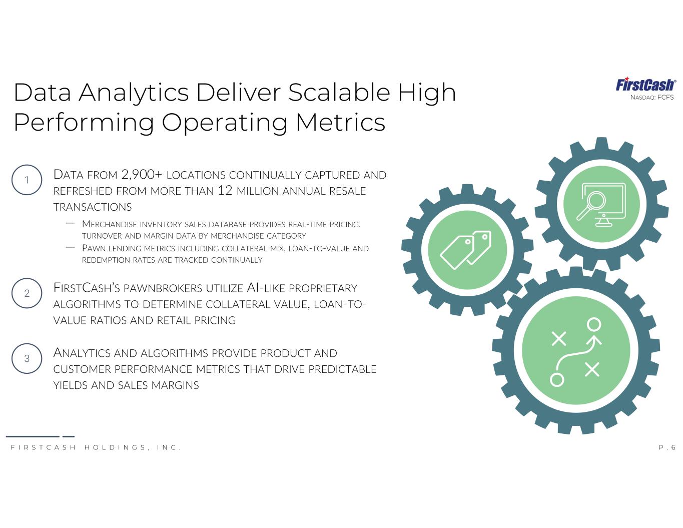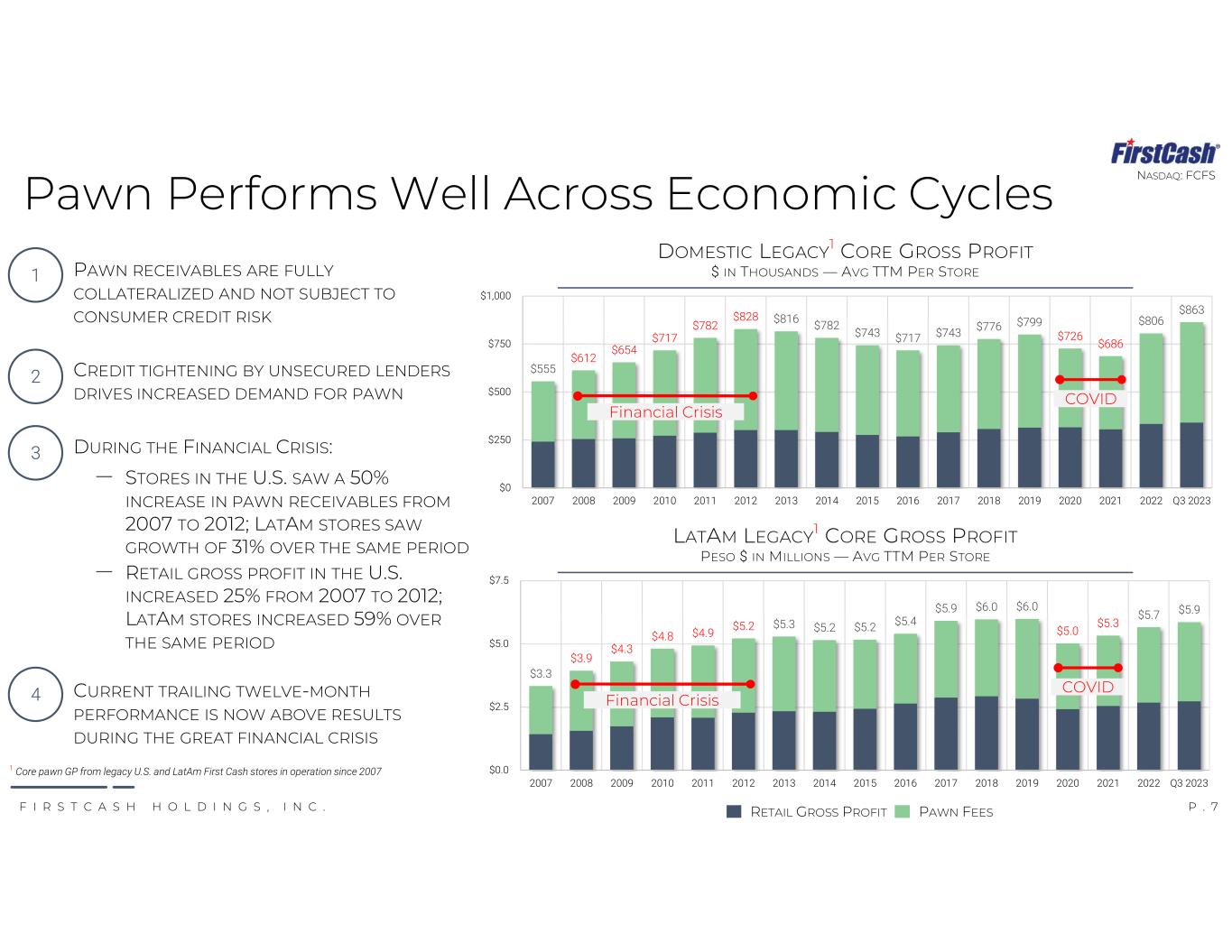 P . 6F I R S T C A S H H O L D I N G S , I N C . NASDAQ: FCFSData Analytics Deliver Scalable High Performing Operating Metrics DATA FROM 2,900+ LOCATIONS CONTINUALLY CAPTURED AND REFRESHED FROM MORE THAN 12 MILLION ANNUAL RESALE TRANSACTIONS ‒ MERCHANDISE INVENTORY SALES DATABASE PROVIDES REAL-TIME PRICING, TURNOVER AND MARGIN DATA BY MERCHANDISE CATEGORY ‒ PAWN LENDING METRICS INCLUDING COLLATERAL MIX, LOAN-TO-VALUE AND REDEMPTION RATES ARE TRACKED CONTINUALLY FIRSTCASH’S PAWNBROKERS UTILIZE AI-LIKE PROPRIETARY ALGORITHMS TO DETERMINE COLLATERAL VALUE, LOAN-TO- VALUE RATIOS AND RETAIL PRICING ANALYTICS AND ALGORITHMS PROVIDE PRODUCT AND CUSTOMER PERFORMANCE METRICS THAT DRIVE PREDICTABLE YIELDS AND SALES MARGINS 1 2 3