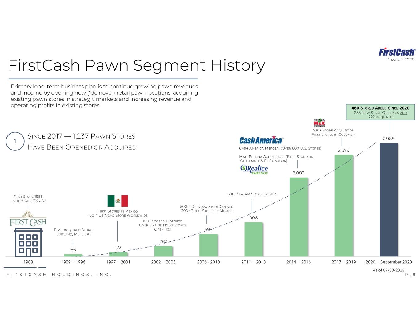 P . 8F I R S T C A S H H O L D I N G S , I N C . NASDAQ: FCFSPawn Collateral and Inventory Composition U.S. PAWN LATAM PAWN CONSOLIDATED PAWN 34% 58%69% 48%32%55% 47%11% 22% 50%15% 26% PAWN COLLATERAL PAWN COLLATERAL PAWN COLLATERAL INVENTORY INVENTORY INVENTORY As of 09/30/2023 JEWELRY ELECTRONICS TOOLS SPORTING GOODS MUSICAL INSTRUMENTS OTHER