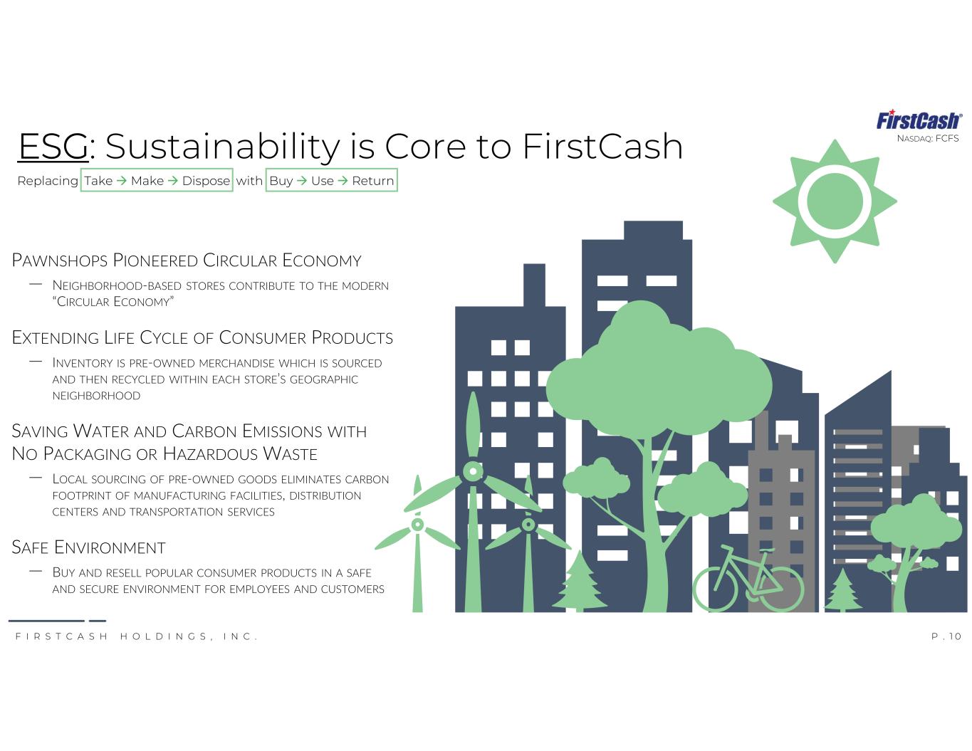 P . 1 0F I R S T C A S H H O L D I N G S , I N C . NASDAQ: FCFS PAWNSHOPS PIONEERED CIRCULAR ECONOMY ‒ NEIGHBORHOOD-BASED STORES CONTRIBUTE TO THE MODERN “CIRCULAR ECONOMY” EXTENDING LIFE CYCLE OF CONSUMER PRODUCTS – INVENTORY IS PRE-OWNED MERCHANDISE WHICH IS SOURCED AND THEN RECYCLED WITHIN EACH STORE’S GEOGRAPHIC NEIGHBORHOOD SAVING WATER AND CARBON EMISSIONS WITH NO PACKAGING OR HAZARDOUS WASTE ‒ LOCAL SOURCING OF PRE-OWNED GOODS ELIMINATES CARBON FOOTPRINT OF MANUFACTURING FACILITIES, DISTRIBUTION CENTERS AND TRANSPORTATION SERVICES SAFE ENVIRONMENT ‒ BUY AND RESELL POPULAR CONSUMER PRODUCTS IN A SAFE AND SECURE ENVIRONMENT FOR EMPLOYEES AND CUSTOMERS ESG: Sustainability is Core to FirstCash Replacing Take Make  Dispose with Buy  Use  Return