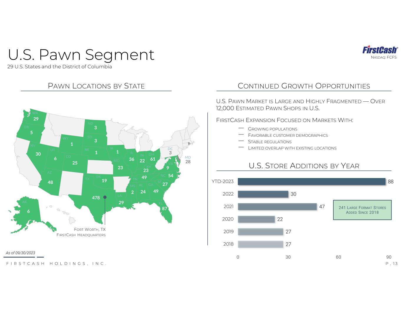 P . 1 2F I R S T C A S H H O L D I N G S , I N C . NASDAQ: FCFS ALMOST 1,200 FULL-SERVICE U.S. LOCATIONS 29 STATES AND THE DISTRICT OF COLUMBIA DOMESTIC PAWN SEGMENT