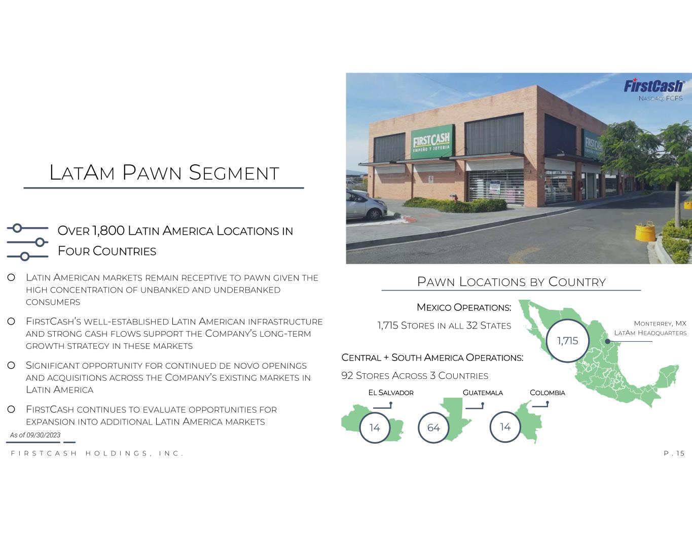 F I R S T C A S H H O L D I N G S , I N C . NASDAQ: FCFS P . 1 4 $305 $335 $179 $205 $0 $100 $200 $300 $400 $500 Q3 2022 Q3 2023 Q3 2022 Q3 2023 REVENUE NET REVENUE RETAIL PAWN FEES SCRAP Q3 2023 U.S. Pawn Segment Highlights — $ in Millions +10% +15% $280 $341 15% 8% 5% 6% 11% 0% 6% 12% 18% 24% $0 $100 $200 $300 $400 Q 3 Q 4 20 22 Q 1 Q 2 Q 3 ALL STORES SAME-STORES YOY % REVENUE SEGMENT CONTRIBUTION PAWN RECEIVABLES $70 $84 $0 $25 $50 $75 $100 $125 Q3 2022 Q3 2023 138% 148% 174% 170% 156% 161% 0% 50% 100% 150% 200% $0 $250 $500 $750 $1,000 2018 2019 2020 2021 2022 TTM Q3 2023 PAWN FEES RETAIL GP SCRAP GP GP RETURN/EARNING ASSETS 44% 44% 41% 43% 16% 21% 23% 25% 0% 15% 30% 45% 60% Q 3 Q 4 20 20 Q 1 Q 2 Q 3 Q 4 20 21 Q 1 Q 2 Q 3 Q 4 20 22 Q 1 Q 2 Q 3 QTD RETAIL MARGIN QTD SEGMENT PRE-TAX PROFIT MARGIN RETURN ON EARNING ASSETSMARGINS: +20% +22% YOY