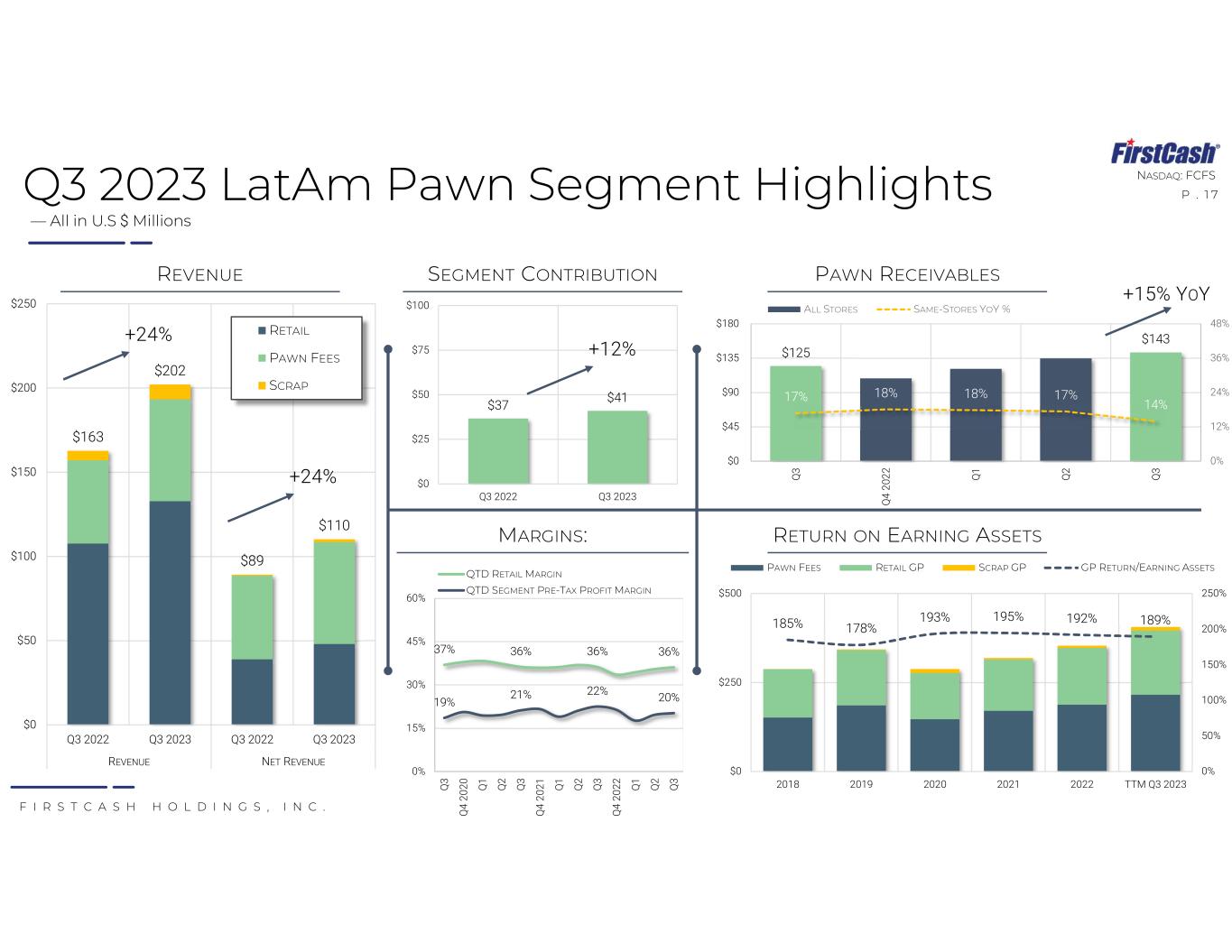 F I R S T C A S H H O L D I N G S , I N C . NASDAQ: FCFS P . 1 7 $163 $202 $89 $110 $0 $50 $100 $150 $200 $250 Q3 2022 Q3 2023 Q3 2022 Q3 2023 REVENUE NET REVENUE RETAIL PAWN FEES SCRAP Q3 2023 LatAm Pawn Segment Highlights — All in U.S $ Millions +24% +24% $125 $143 17% 18% 18% 17% 14% 0% 12% 24% 36% 48% $0 $45 $90 $135 $180 Q 3 Q 4 20 22 Q 1 Q 2 Q 3 ALL STORES SAME-STORES YOY % REVENUE SEGMENT CONTRIBUTION PAWN RECEIVABLES $37 $41 $0 $25 $50 $75 $100 Q3 2022 Q3 2023 185% 178% 193% 195% 192% 189% 0% 50% 100% 150% 200% 250% $0 $250 $500 2018 2019 2020 2021 2022 TTM Q3 2023 PAWN FEES RETAIL GP SCRAP GP GP RETURN/EARNING ASSETS 37% 36% 36% 36% 19% 21% 22% 20% 0% 15% 30% 45% 60% Q 3 Q 4 20 20 Q 1 Q 2 Q 3 Q 4 20 21 Q 1 Q 2 Q 3 Q 4 20 22 Q 1 Q 2 Q 3 QTD RETAIL MARGIN QTD SEGMENT PRE-TAX PROFIT MARGIN RETURN ON EARNING ASSETSMARGINS: +12% +15% YOY