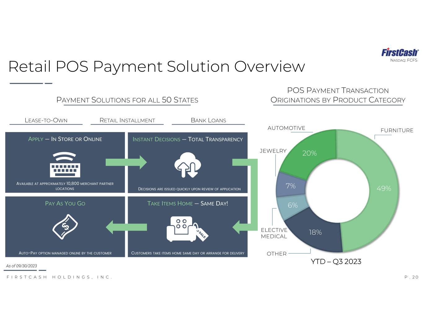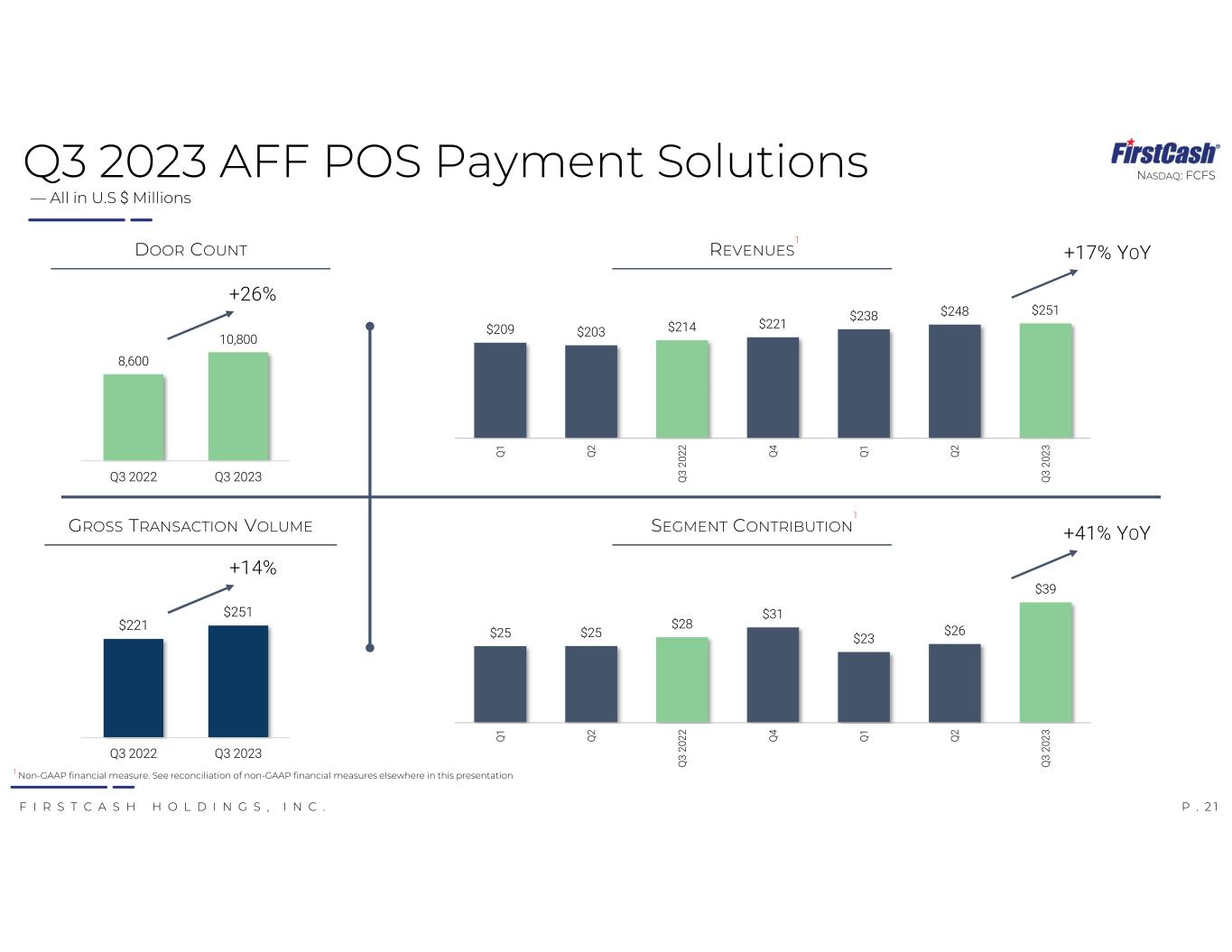 P . 2 0F I R S T C A S H H O L D I N G S , I N C . NASDAQ: FCFS CUSTOMERS TAKE ITEMS HOME SAME DAY OR ARRANGE FOR DELIVERY TAKE ITEMS HOME — SAME DAY! AUTO-PAY OPTION MANAGED ONLINE BY THE CUSTOMER PAY AS YOU GO PAYMENT SOLUTIONS FOR ALL 50 STATES LEASE-TO-OWN BANK LOANSRETAIL INSTALLMENT AVAILABLE AT APPROXIMATELY 10,800 MERCHANT PARTNER LOCATIONS DECISIONS ARE ISSUED QUICKLY UPON REVIEW OF APPLICATION APPLY — IN STORE OR ONLINE INSTANT DECISIONS — TOTAL TRANSPARENCY POS PAYMENT TRANSACTION ORIGINATIONS BY PRODUCT CATEGORY 49% 18% 6% 7% 20% FURNITURE ELECTIVE MEDICAL JEWELRY AUTOMOTIVE Retail POS Payment Solution Overview YTD – Q3 2023 As of 09/30/2023 OTHER