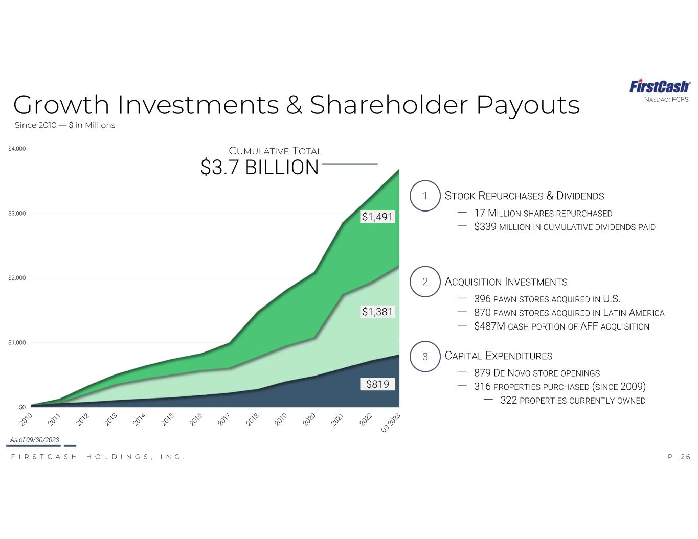 P . 2 5F I R S T C A S H H O L D I N G S , I N C . NASDAQ: FCFS As of 09/30/2023 Cash Dividends & Share Repurchases $0.125 $0.19 $0.22 $0.25 $0.27 $0.27 $0.30 $0.33 $0.125 $0.19 $0.22 $0.25 $0.27 $0.30 $0.30 $0.33 $0.125 $0.19 $0.22 $0.25 $0.27 $0.30 $0.33 $0.35 $0.19 $0.20 $0.25 $0.27 $0.27 $0.30 $0.33 $0.35 $0.57 $0.77 $0.91 $1.02 $1.08 $1.17 $1.26 $1.36 $0.00 $0.25 $0.50 $0.75 $1.00 $1.25 $1.50 2016 2017 2018 2019 2020 2021 2022 2023 EXPECTED QUARTER 1 QUARTER 2 QUARTER 3 QUARTER 4 CASH DIVIDEND HISTORY ACTIVE SHARE REPURCHASE PROGRAM $275 $114 $107 $50 $158 $114 $93 $368 $482 $588 $638 $796 $910 1,616 4,959 6,264 7,691 8,379 10,583 11,831 0 6,000 12,000 18,000 24,000 $0 $200 $400 $600 $800 $1,000 2017 2018 2019 2020 2021 2022 Q3 2023 C U M U LA T IV E C O U N T S H A R E R EP U R C H A SE D C U M U LA T IV E S H A R E R EP U R C H A SE S (M IL LI O N S ) ANNUAL REPURCHASES – CURRENT YEAR CUMULATIVE COUNT SHARES REPURCHASED Q3 DIVIDEND INCREASED TO $0.35; ANNUALIZES TO $1.40 PER SHARE JULY 2023 BUYBACK AUTHORIZATION PROVIDES FOR $200 MILLION OF FUTURE SHARE REPURCHASES GOLD OUTLINE IDENTIFIES QUARTERLY DIVIDEND INCREASE