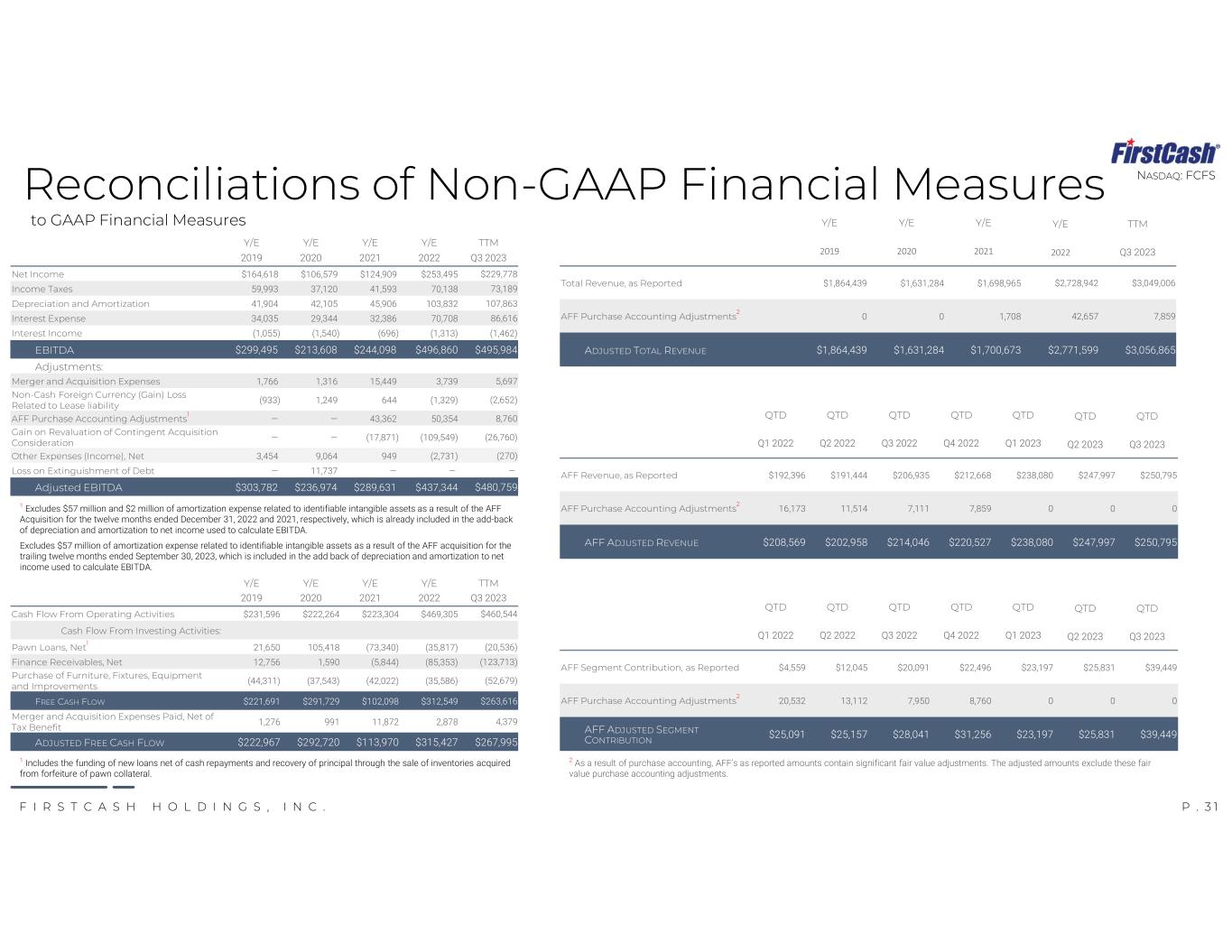P . 3 1F I R S T C A S H H O L D I N G S , I N C . NASDAQ: FCFSReconciliations of Non-GAAP Financial Measures to GAAP Financial Measures TTMY/EY/EY/EY/E Q3 20232022202120202019 $229,778 $253,495$124,909$106,579$164,618Net Income 73,18970,13841,59337,12059,993Income Taxes 107,863103,83245,90642,10541,904Depreciation and Amortization 86,61670,70832,38629,34434,035Interest Expense (1,462)(1,313)(696)(1,540)(1,055)Interest Income $495,984 $496,860$244,098$213,608$299,495EBITDA Adjustments: 5,6973,73915,4491,3161,766Merger and Acquisition Expenses (2,652)(1,329)6441,249(933) Non-Cash Foreign Currency (Gain) Loss Related to Lease liability 8,76050,35443,362——AFF Purchase Accounting Adjustments 1 (26,760)(109,549)(17,871)—— Gain on Revaluation of Contingent Acquisition Consideration (270) (2,731)9499,0643,454Other Expenses (Income), Net ———11,737—Loss on Extinguishment of Debt $480,759 $437,344$289,631$236,974$303,782Adjusted EBITDA TTMY/EY/EY/EY/E Q3 20232022202120202019 $3,049,006 $2,728,942 $1,698,965 $1,631,284 $1,864,439 Total Revenue, as Reported 7,85942,6571,708 0 0 AFF Purchase Accounting Adjustments 2 $3,056,865 $2,771,599 $1,700,673 $1,631,284 $1,864,439 ADJUSTED TOTAL REVENUE TTMY/EY/EY/EY/E Q3 20232022202120202019 $460,544 $469,305 $223,304 $222,264 $231,596 Cash Flow From Operating Activities Cash Flow From Investing Activities: (20,536)(35,817)(73,340)105,418 21,650 Pawn Loans, Net 1 (123,713)(85,353)(5,844)1,590 12,756 Finance Receivables, Net (52,679)(35,586)(42,022)(37,543)(44,311) Purchase of Furniture, Fixtures, Equipment and Improvements $263,616 $312,549 $102,098 $291,729 $221,691 FREE CASH FLOW 4,3792,878 11,872 991 1,276 Merger and Acquisition Expenses Paid, Net of Tax Benefit $267,995 $315,427$113,970 $292,720 $222,967 ADJUSTED FREE CASH FLOW 1 Excludes $57 million and $2 million of amortization expense related to identifiable intangible assets as a result of the AFF Acquisition for the twelve months ended December 31, 2022 and 2021, respectively, which is already included in the add-back of depreciation and amortization to net income used to calculate EBITDA. Excludes $57 million of amortization expense related to identifiable intangible assets as a result of the AFF acquisition for the trailing twelve months ended September 30, 2023, which is included in the add back of depreciation and amortization to net income used to calculate EBITDA. 1 Includes the funding of new loans net of cash repayments and recovery of principal through the sale of inventories acquired from forfeiture of pawn collateral. 2 As a result of purchase accounting, AFF’s as reported amounts contain significant fair value adjustments. The adjusted amounts exclude these fair value purchase accounting adjustments. QTDQTDQTDQTDQTDQTDQTD Q3 2023Q2 2023Q1 2023Q4 2022Q3 2022Q2 2022Q1 2022 $250,795 $247,997 $238,080 $212,668 $206,935 $191,444 $192,396 AFF Revenue, as Reported 0 0 0 7,859 7,111 11,514 16,173 AFF Purchase Accounting Adjustments 2 $250,795 $247,997 $238,080 $220,527 $214,046 $202,958 $208,569 AFF ADJUSTED REVENUE QTDQTDQTDQTDQTDQTDQTD Q3 2023Q2 2023Q1 2023Q4 2022Q3 2022Q2 2022Q1 2022 $39,449 $25,831 $23,197 $22,496 $20,091 $12,045 $4,559 AFF Segment Contribution, as Reported 0 0 0 8,760 7,950 13,112 20,532 AFF Purchase Accounting Adjustments 2 $39,449 $25,831 $23,197 $31,256 $28,041 $25,157 $25,091 AFF ADJUSTED SEGMENT CONTRIBUTION