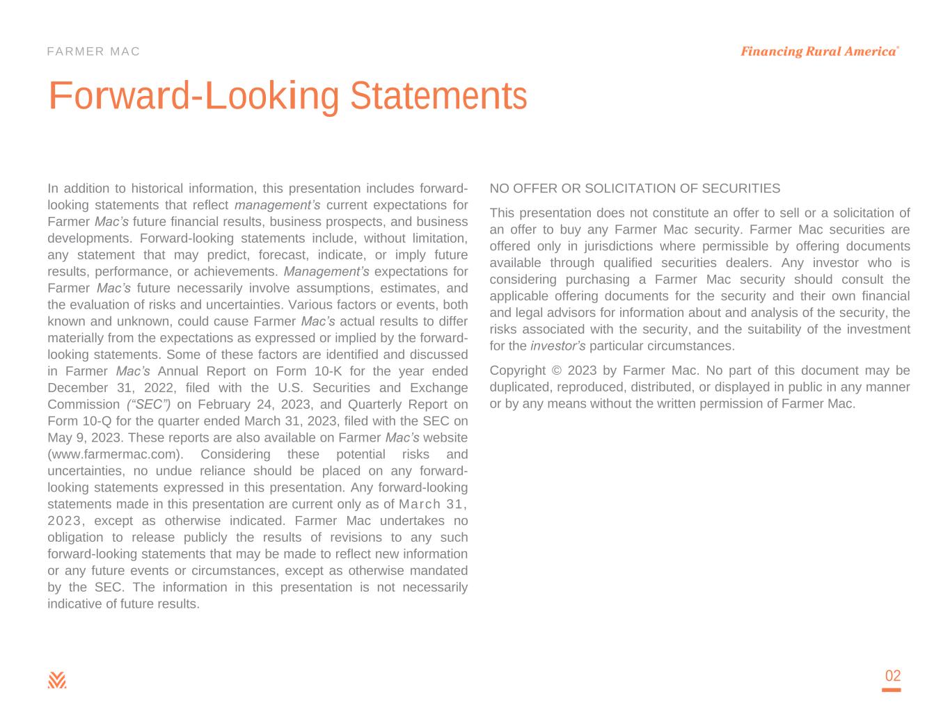FARMER MAC Forward-Looking Statements In addition to historical information, this presentation includes forward- looking statements that reflect management’s current expectations for Farmer Mac’s future financial results, business prospects, and business developments. Forward-looking statements include, without limitation, any statement that may predict, forecast, indicate, or imply future results, performance, or achievements. Management’s expectations for Farmer Mac’s future necessarily involve assumptions, estimates, and the evaluation of risks and uncertainties. Various factors or events, both known and unknown, could cause Farmer Mac’s actual results to differ materially from the expectations as expressed or implied by the forward- looking statements. Some of these factors are identified and discussed in Farmer Mac’s Annual Report on Form 10-K for the year ended December 31, 2022, filed with the U.S. Securities and Exchange Commission (“SEC”) on February 24, 2023, and Quarterly Report on Form 10-Q for the quarter ended March 31, 2023, filed with the SEC on May 9, 2023. These reports are also available on Farmer Mac’s website (www.farmermac.com). Considering these potential risks and uncertainties, no undue reliance should be placed on any forward- looking statements expressed in this presentation. Any forward-looking statements made in this presentation are current only as of March 31, 2023, except as otherwise indicated. Farmer Mac undertakes no obligation to release publicly the results of revisions to any such forward-looking statements that may be made to reflect new information or any future events or circumstances, except as otherwise mandated by the SEC. The information in this presentation is not necessarily indicative of future results. NO OFFER OR SOLICITATION OF SECURITIES This presentation does not constitute an offer to sell or a solicitation of an offer to buy any Farmer Mac security. Farmer Mac securities are offered only in jurisdictions where permissible by offering documents available through qualified securities dealers. Any investor who is considering purchasing a Farmer Mac security should consult the applicable offering documents for the security and their own financial and legal advisors for information about and analysis of the security, the risks associated with the security, and the suitability of the investment for the investor’s particular circumstances. Copyright © 2023 by Farmer Mac. No part of this document may be duplicated, reproduced, distributed, or displayed in public in any manner or by any means without the written permission of Farmer Mac. 02