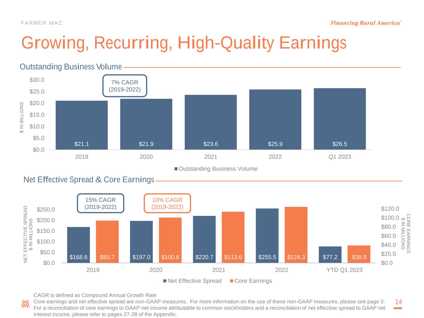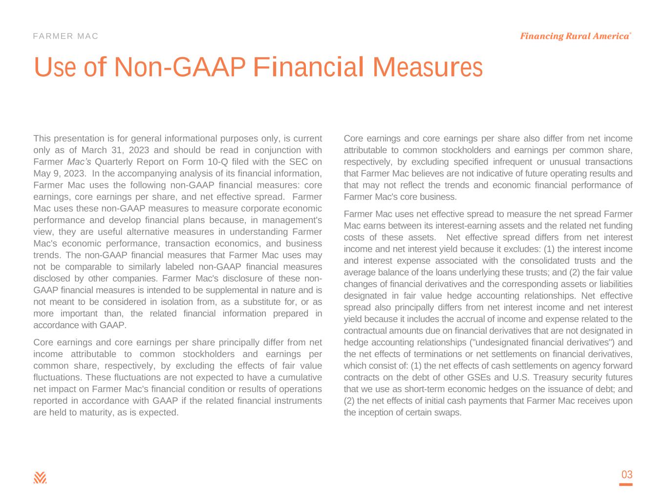 FARMER MAC Use of Non-GAAP Financial Measures This presentation is for general informational purposes only, is current only as of March 31, 2023 and should be read in conjunction with Farmer Mac’s Quarterly Report on Form 10-Q filed with the SEC on May 9, 2023. In the accompanying analysis of its financial information, Farmer Mac uses the following non-GAAP financial measures: core earnings, core earnings per share, and net effective spread. Farmer Mac uses these non-GAAP measures to measure corporate economic performance and develop financial plans because, in management's view, they are useful alternative measures in understanding Farmer Mac's economic performance, transaction economics, and business trends. The non-GAAP financial measures that Farmer Mac uses may not be comparable to similarly labeled non-GAAP financial measures disclosed by other companies. Farmer Mac's disclosure of these non- GAAP financial measures is intended to be supplemental in nature and is not meant to be considered in isolation from, as a substitute for, or as more important than, the related financial information prepared in accordance with GAAP. Core earnings and core earnings per share principally differ from net income attributable to common stockholders and earnings per common share, respectively, by excluding the effects of fair value fluctuations. These fluctuations are not expected to have a cumulative net impact on Farmer Mac's financial condition or results of operations reported in accordance with GAAP if the related financial instruments are held to maturity, as is expected. Core earnings and core earnings per share also differ from net income attributable to common stockholders and earnings per common share, respectively, by excluding specified infrequent or unusual transactions that Farmer Mac believes are not indicative of future operating results and that may not reflect the trends and economic financial performance of Farmer Mac's core business. Farmer Mac uses net effective spread to measure the net spread Farmer Mac earns between its interest-earning assets and the related net funding costs of these assets. Net effective spread differs from net interest income and net interest yield because it excludes: (1) the interest income and interest expense associated with the consolidated trusts and the average balance of the loans underlying these trusts; and (2) the fair value changes of financial derivatives and the corresponding assets or liabilities designated in fair value hedge accounting relationships. Net effective spread also principally differs from net interest income and net interest yield because it includes the accrual of income and expense related to the contractual amounts due on financial derivatives that are not designated in hedge accounting relationships ("undesignated financial derivatives") and the net effects of terminations or net settlements on financial derivatives, which consist of: (1) the net effects of cash settlements on agency forward contracts on the debt of other GSEs and U.S. Treasury security futures that we use as short-term economic hedges on the issuance of debt; and (2) the net effects of initial cash payments that Farmer Mac receives upon the inception of certain swaps. 03