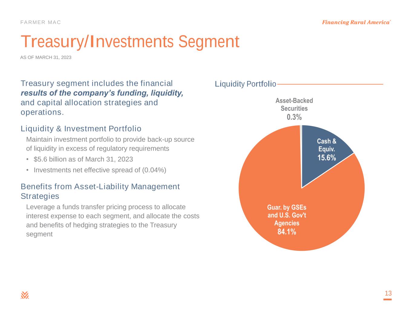 FARMER MAC Northwest 13% Southwest 30% Mid-North 27% Mid-South 17% Northeast 4% Southeast 9% By Geographic Region Crops 50% Permanent Plantings 22% Livestock 18% Part-time Farm 5% Ag. Storage and Processing 5% By Commodity Type Agricultural Finance Loan Portfolio Diversification 12 AS OF MARCH 31, 2023 Agricultural Update • USDA’s Economic Research Service estimates $189.9 billion in net cash incomes in 2022, a significant increase from 2021 and 2020 incomes and a new record in both real and nominal terms. • Net cash income in 2023 is forecast to fall by 21% due to elevated input costs and moderating commodity prices. However, forecast 2023 levels are still well above the 10-year average for farm profitability. (3)